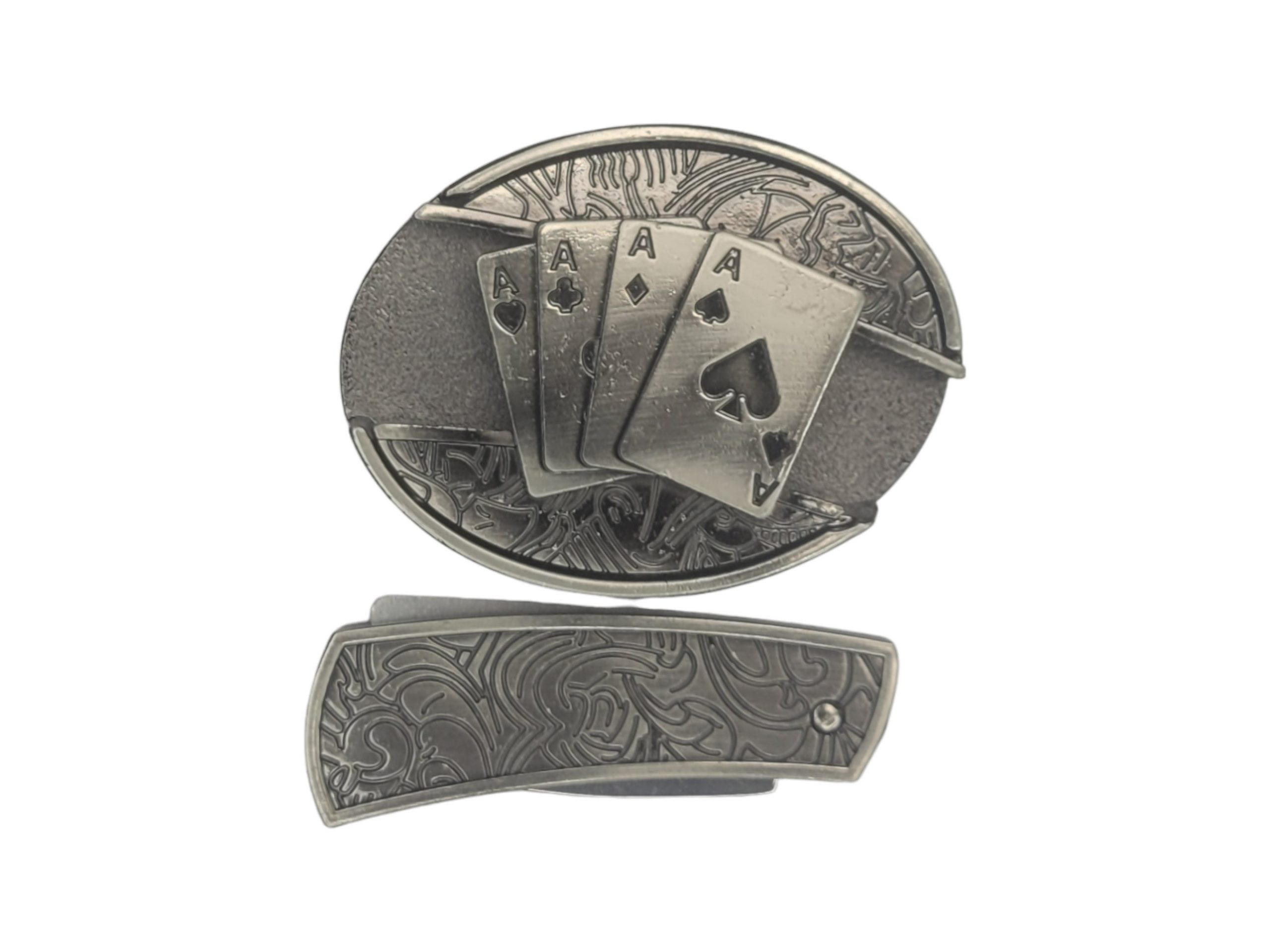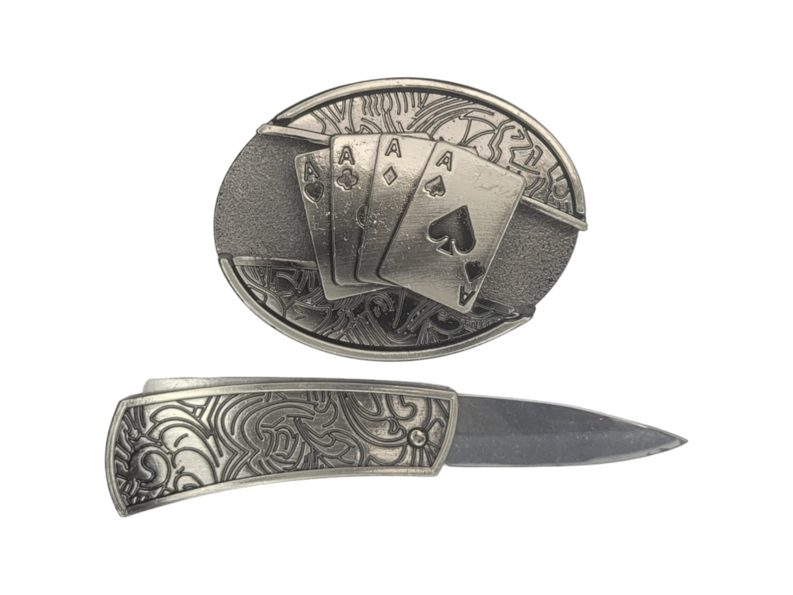 Introducing our stylish Folding Knife Belt Buckle featuring a striking 3D 4 Aces design and an exclusive offer: complimentary laser engraving on the knife! This buckle is meticulously crafted to blend style with practicality. Not only does it keep your pants secure, but it also houses a folding knife in the front. The horizontal channel in the center ensures effortless access to the folding/locking pocket knife, complete with a 2-inch blade and a 3-inch handle.