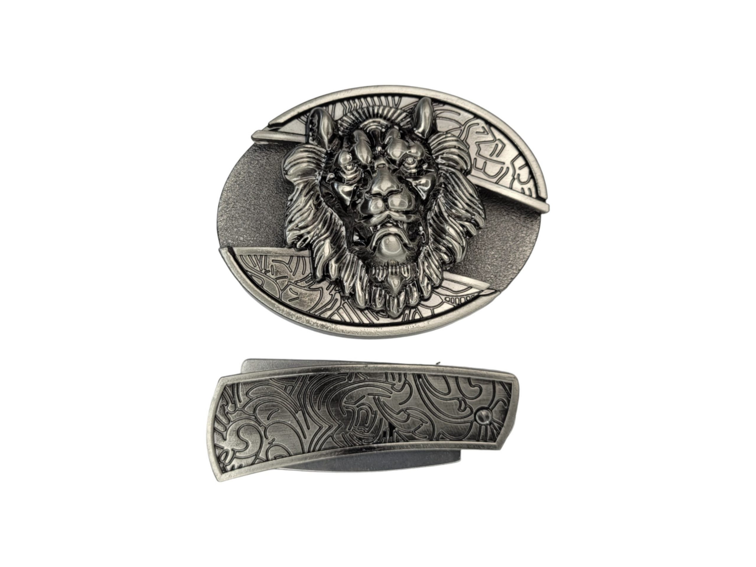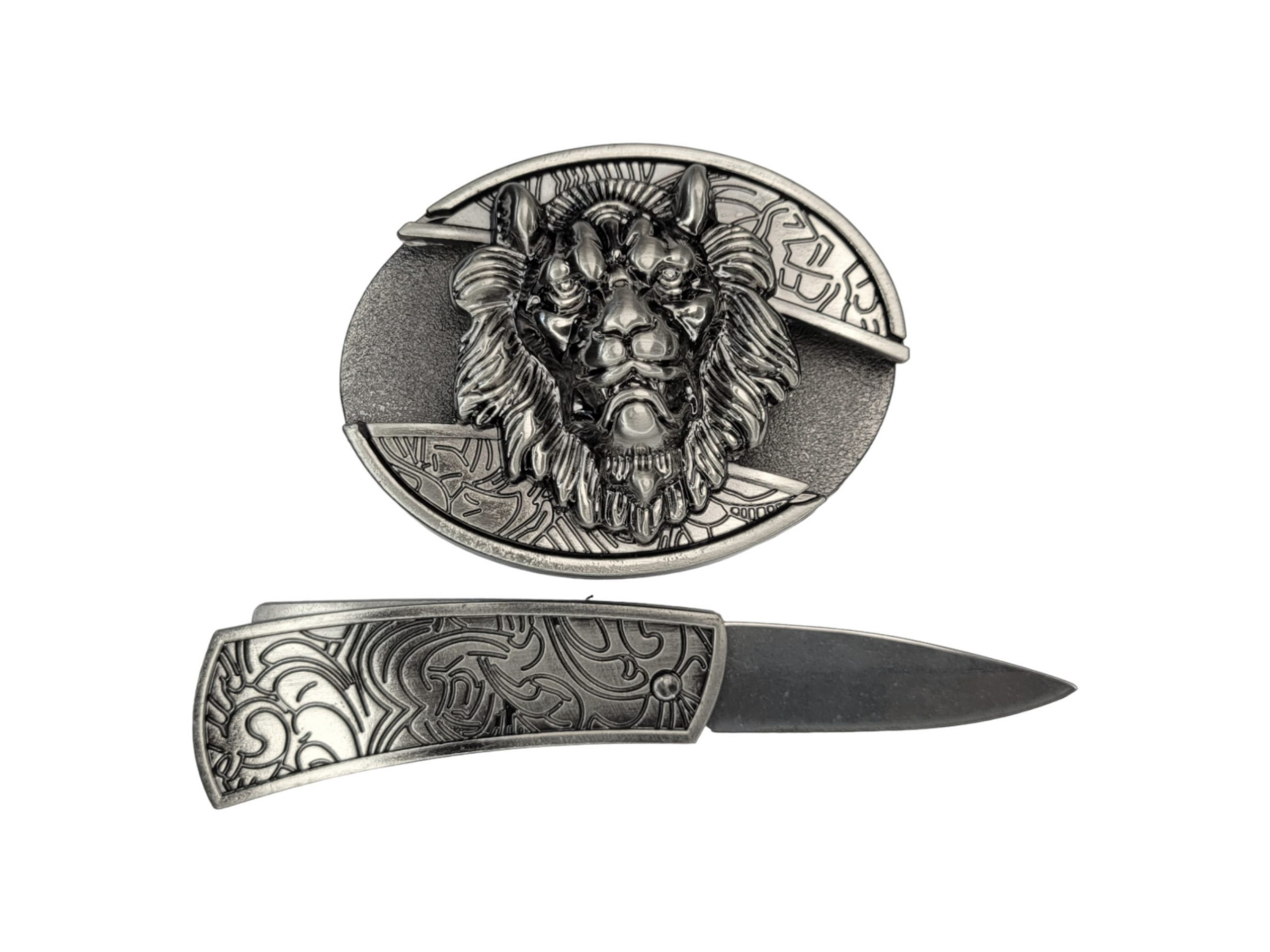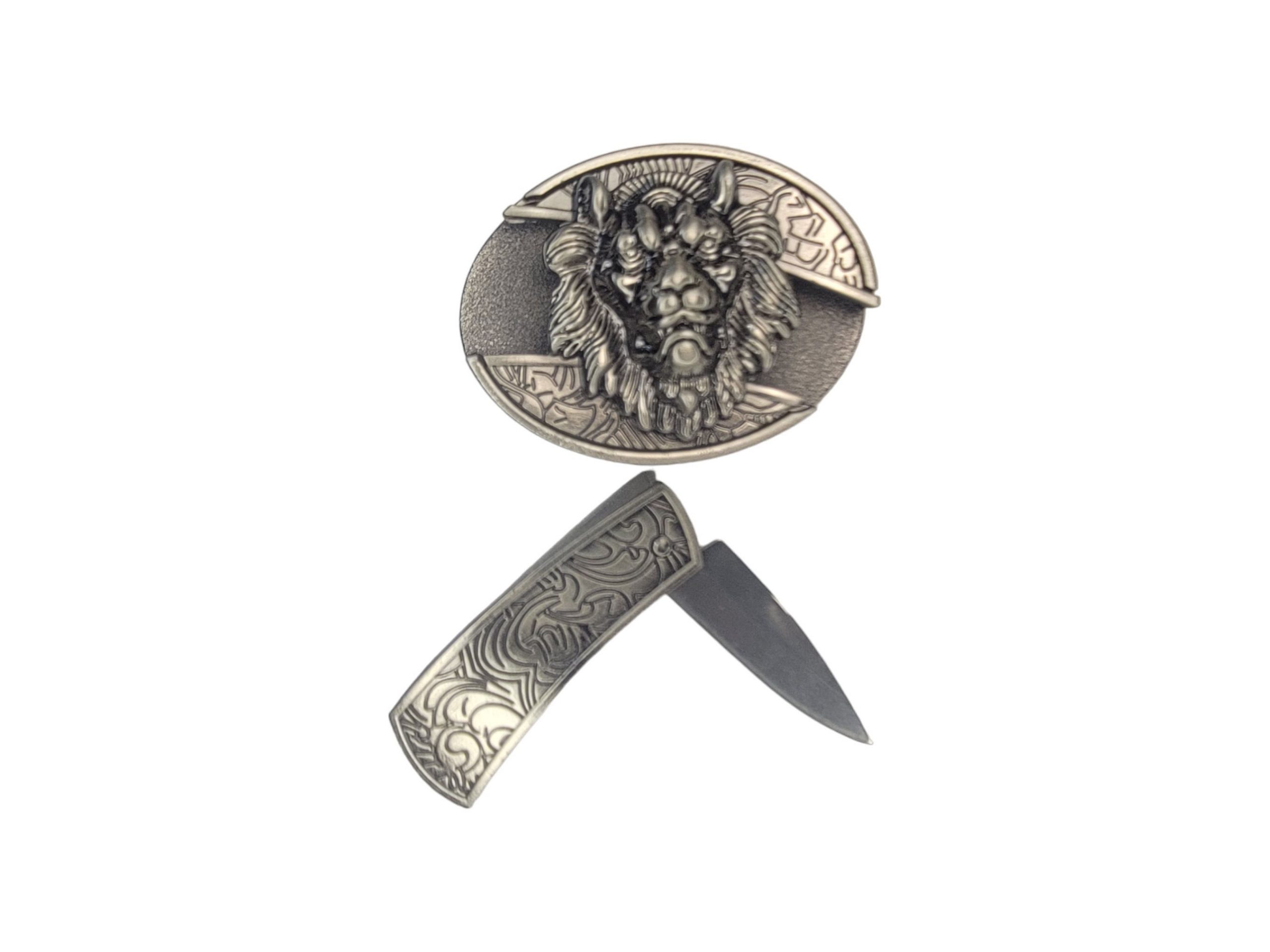 Introducing our Folding Knife Belt Buckle featuring a striking 3D Lion Head design and a vintage silver finish. This belt buckle isn’t just stylish—it’s also functional, housing a small folding knife for added convenience. Whether you’re out in nature or working around the barn, this buckle is the ideal blend of fashion and utility. Plus, take advantage of our special offer: 🎉 free laser engraving 🎉 on the knife!