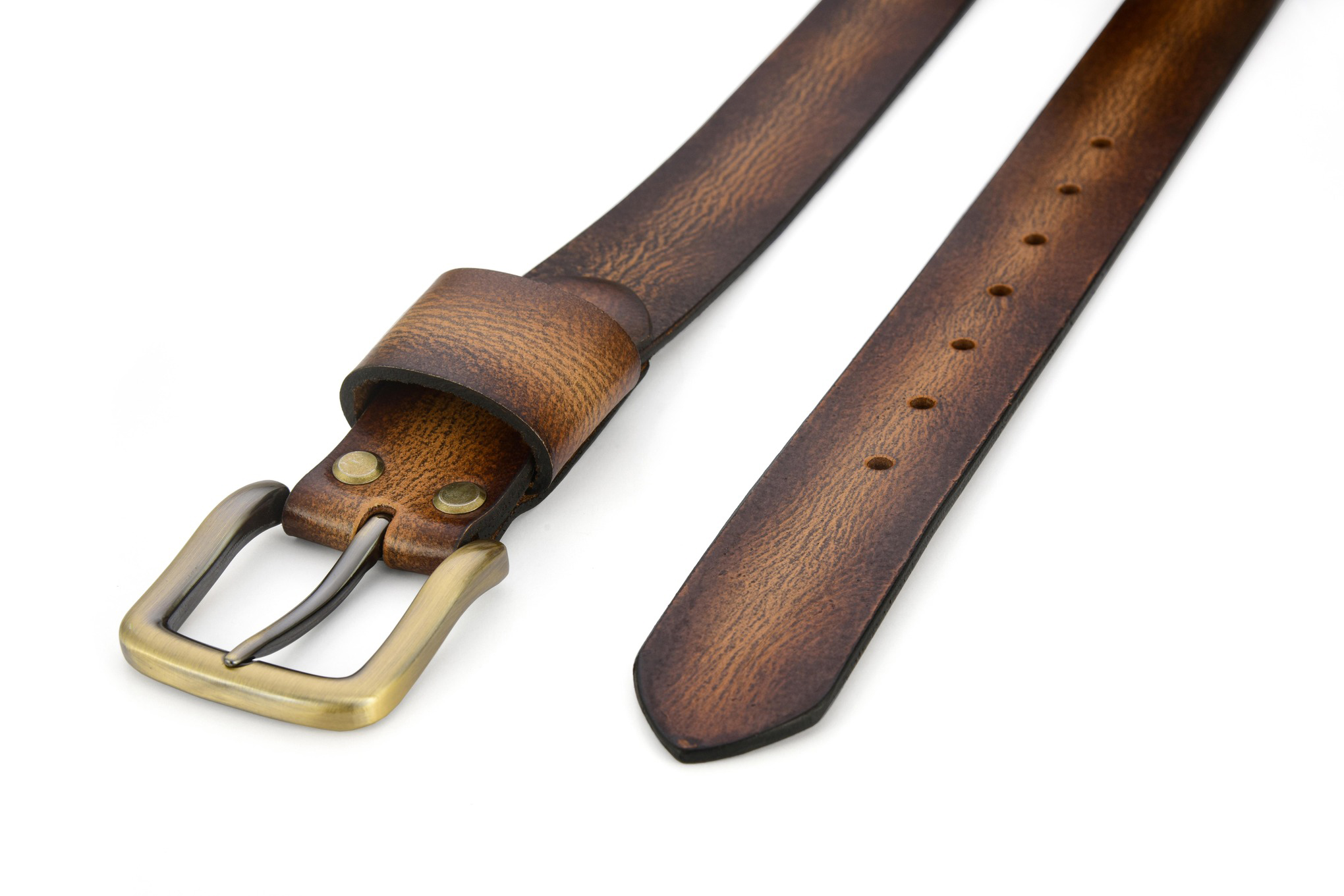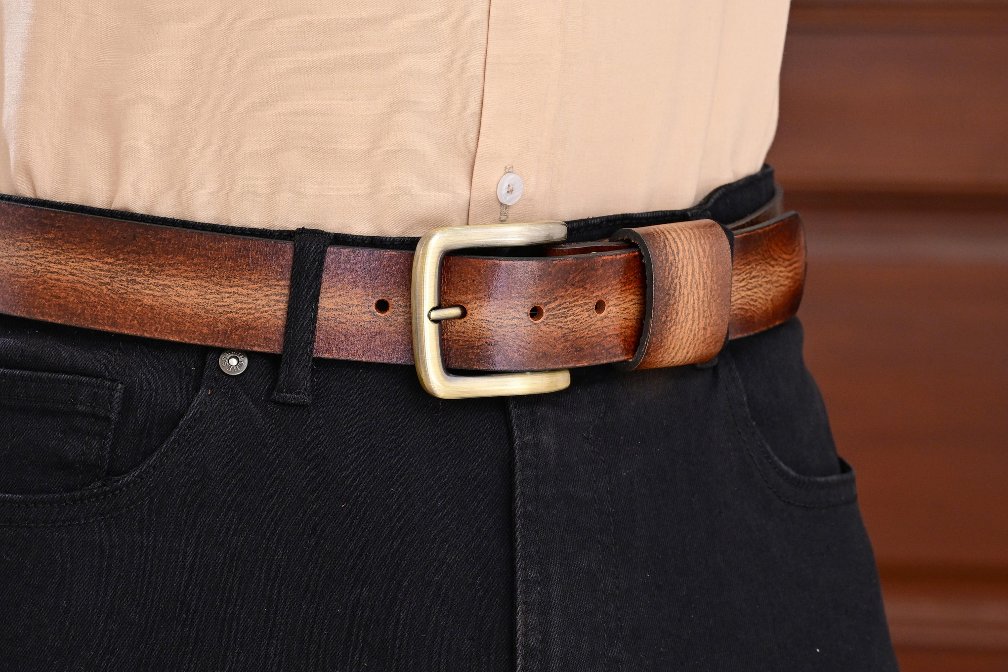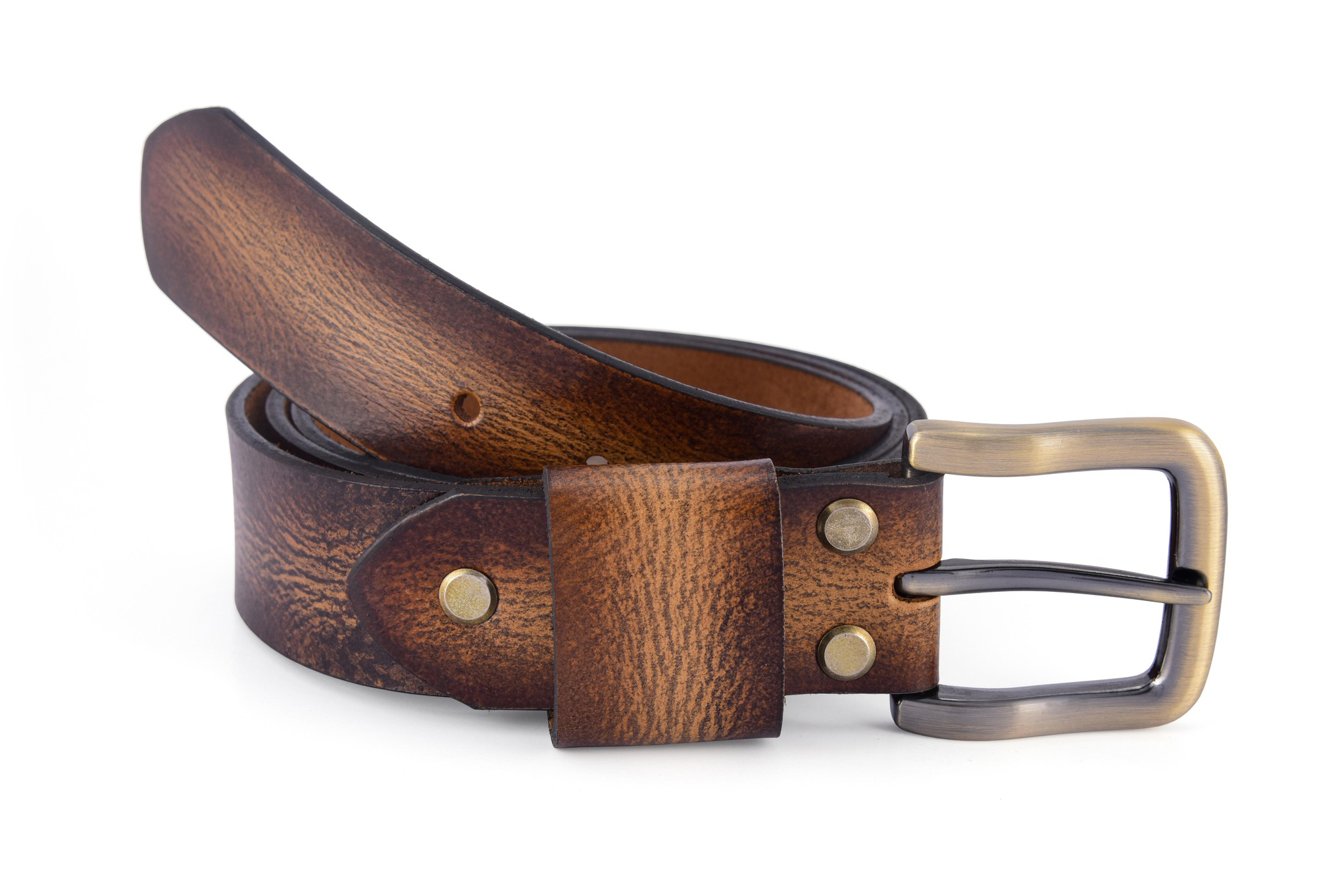 This antique beige leather belt features a vintage gold buckle, crafted from full-grain hand-waxed leather. Personalize it with engraving for a unique, thoughtful gift.