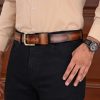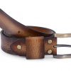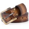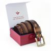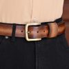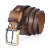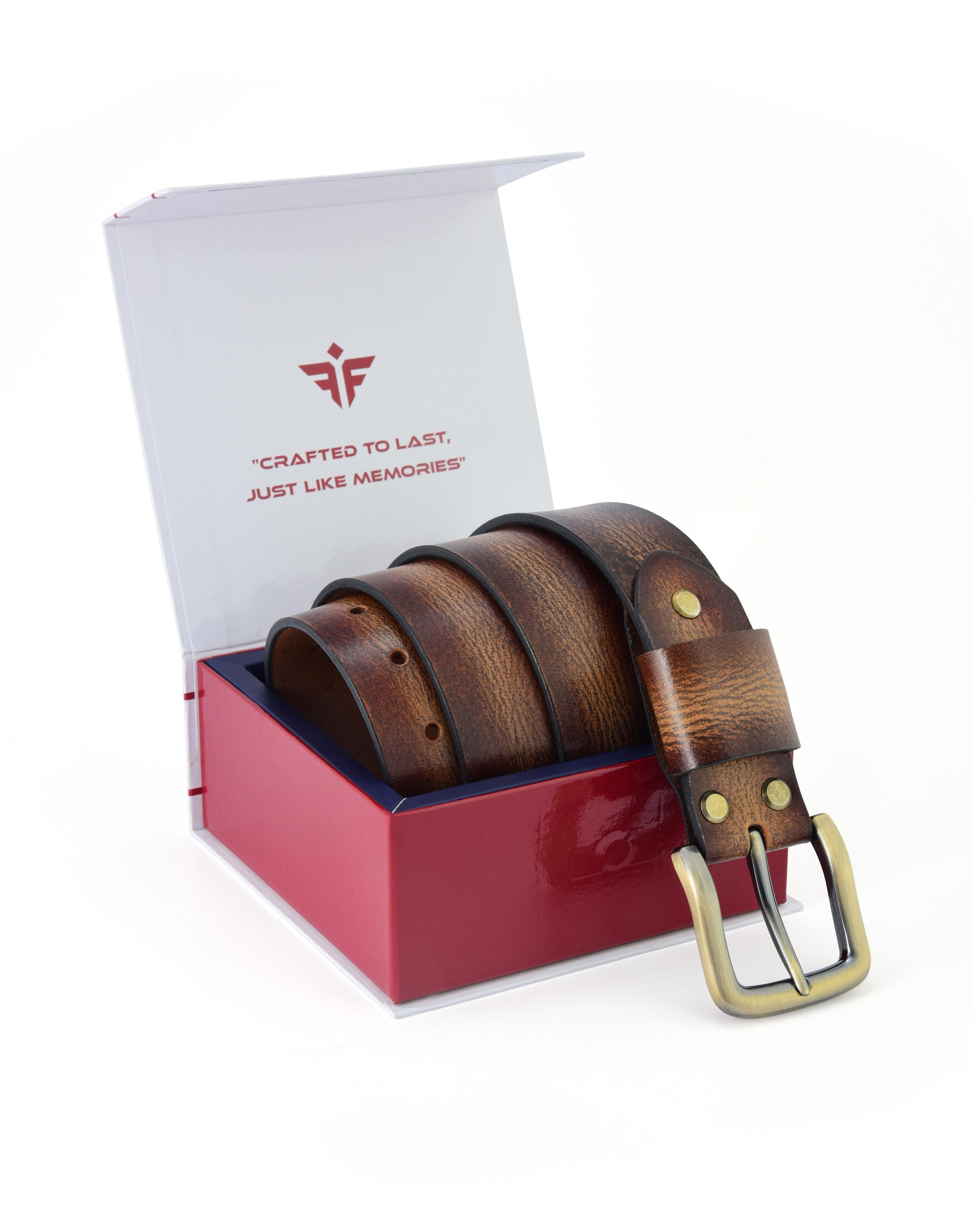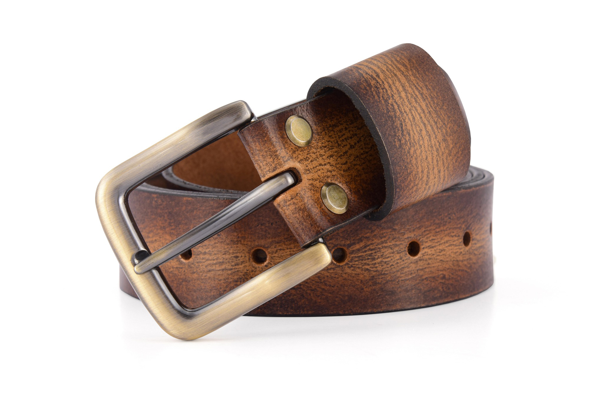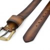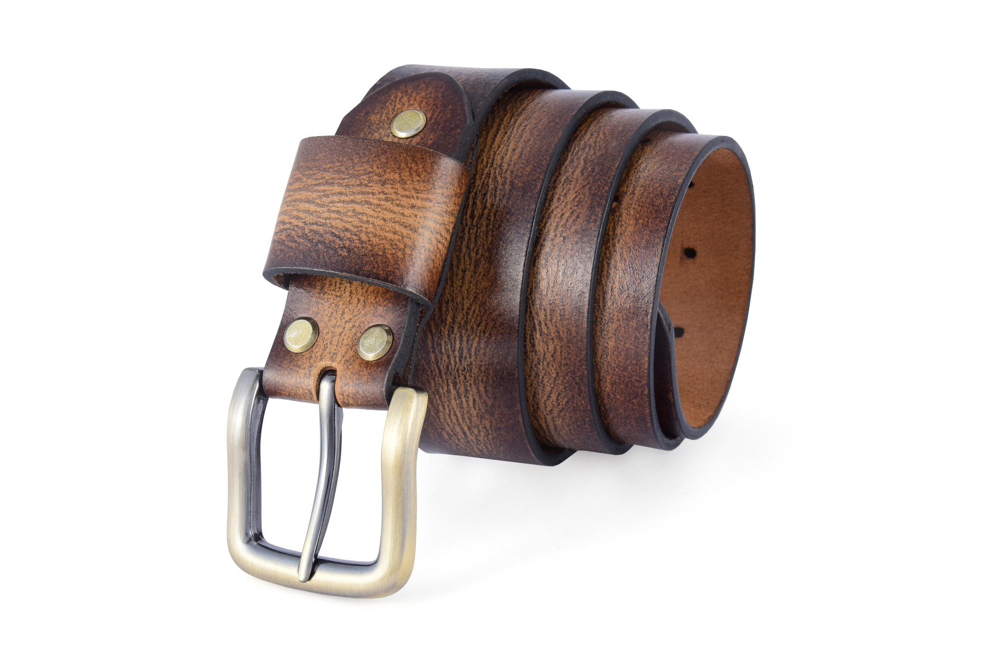 This antique beige leather belt features a vintage gold buckle, crafted from full-grain hand-waxed leather. Personalize it with engraving for a unique, thoughtful gift.