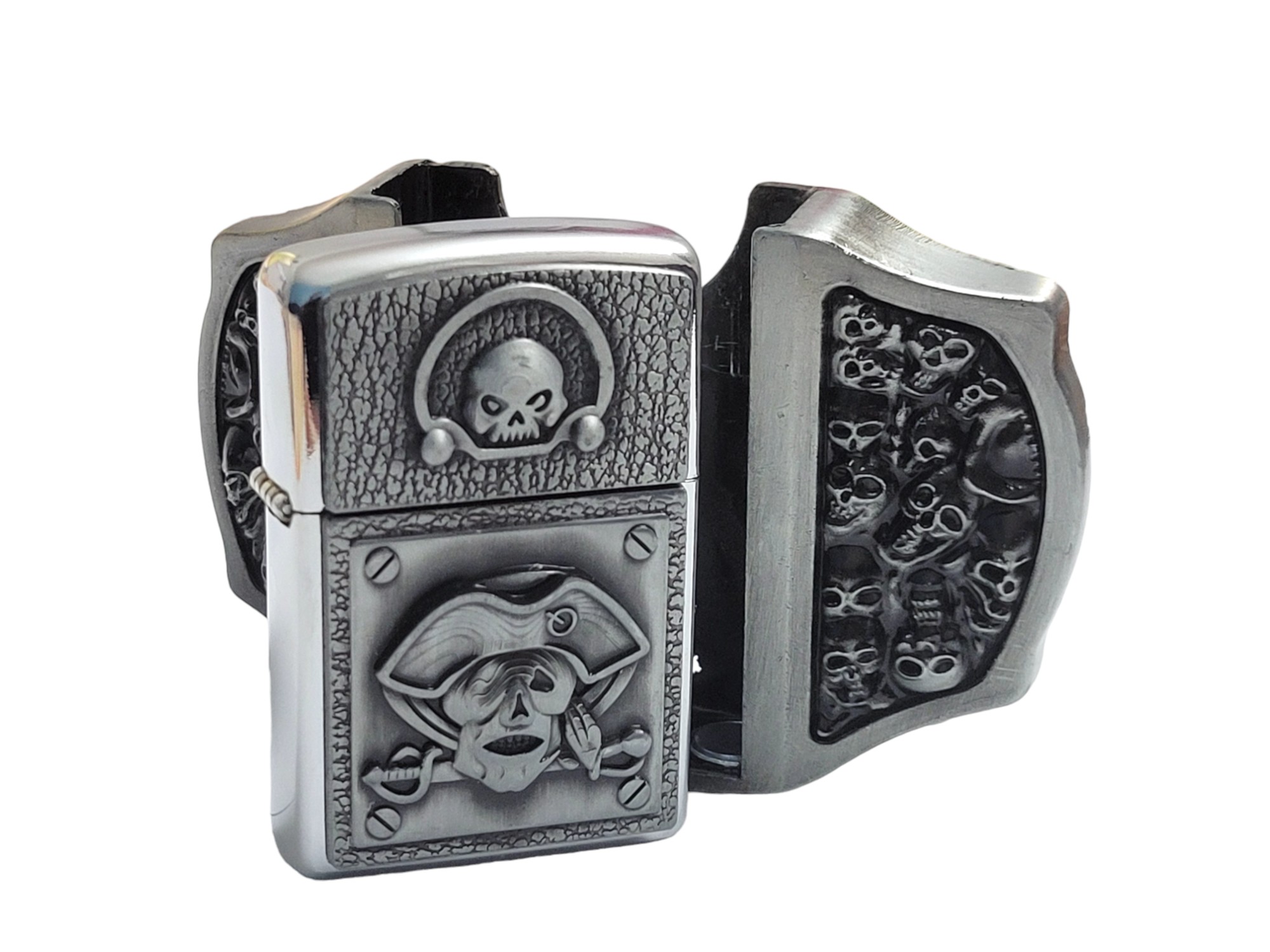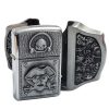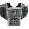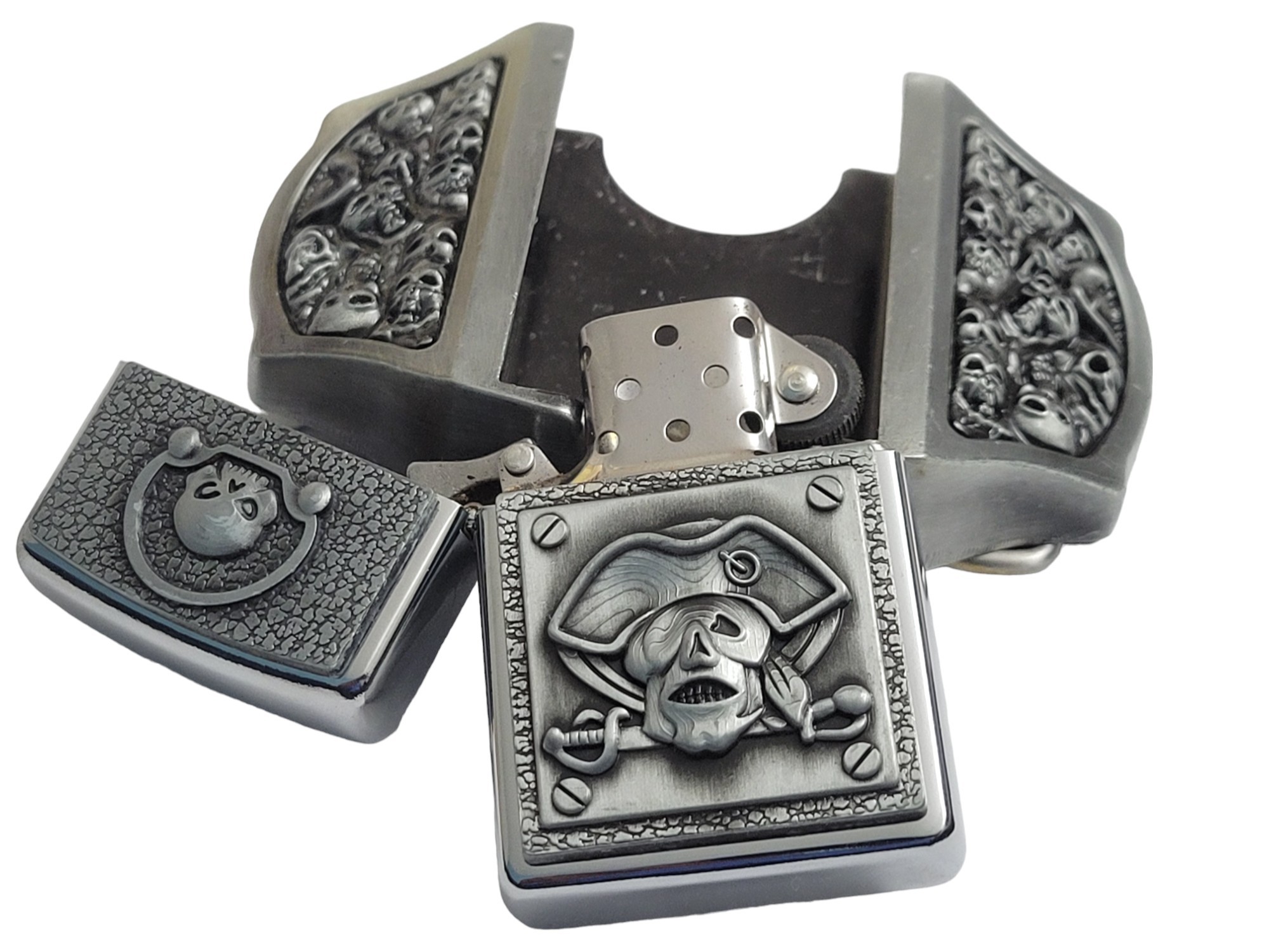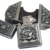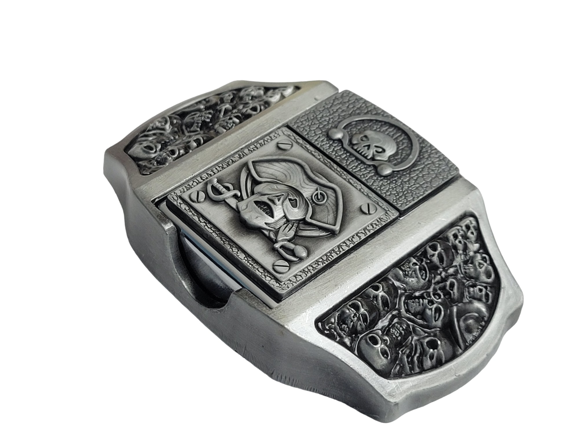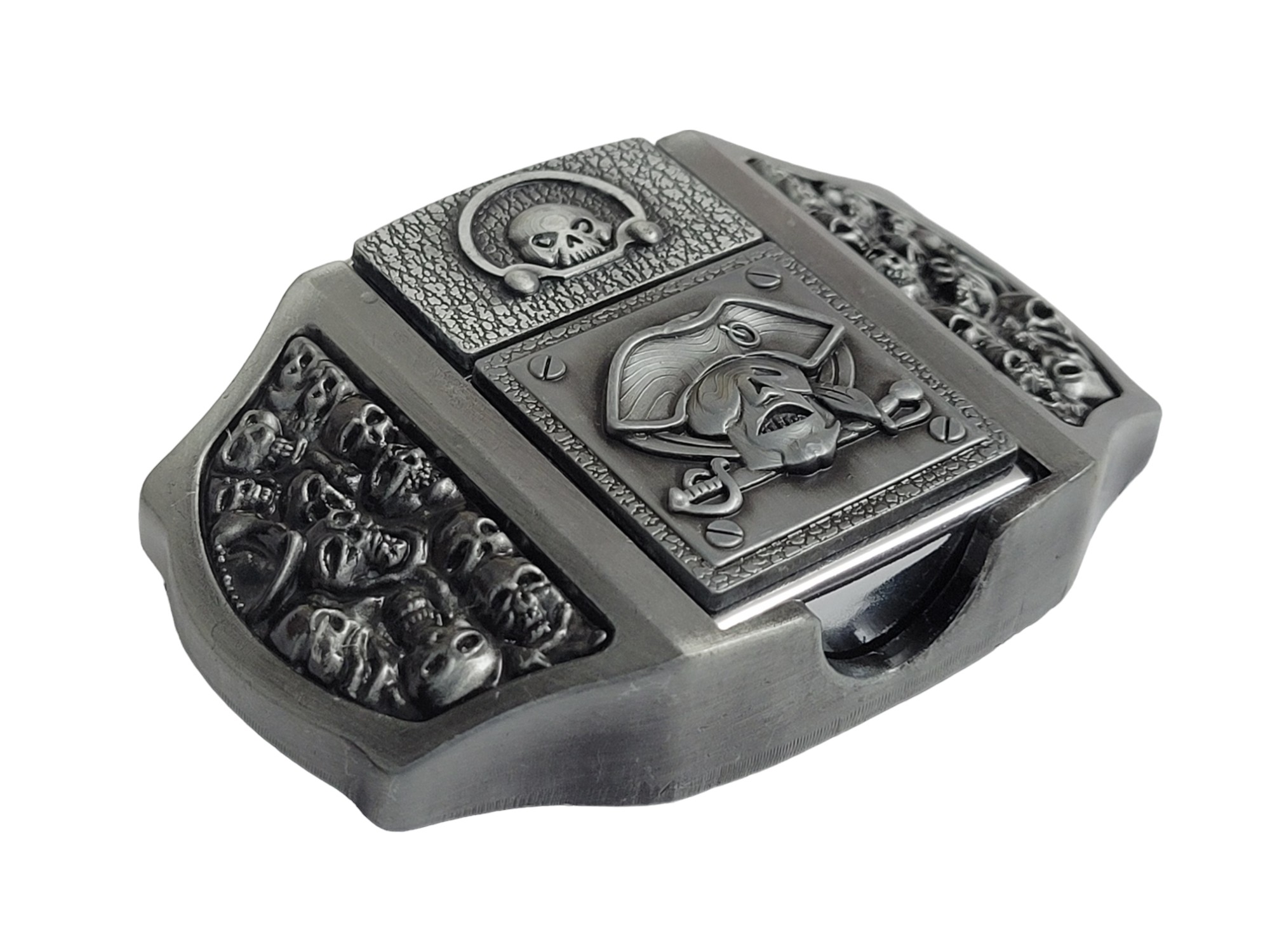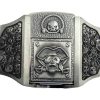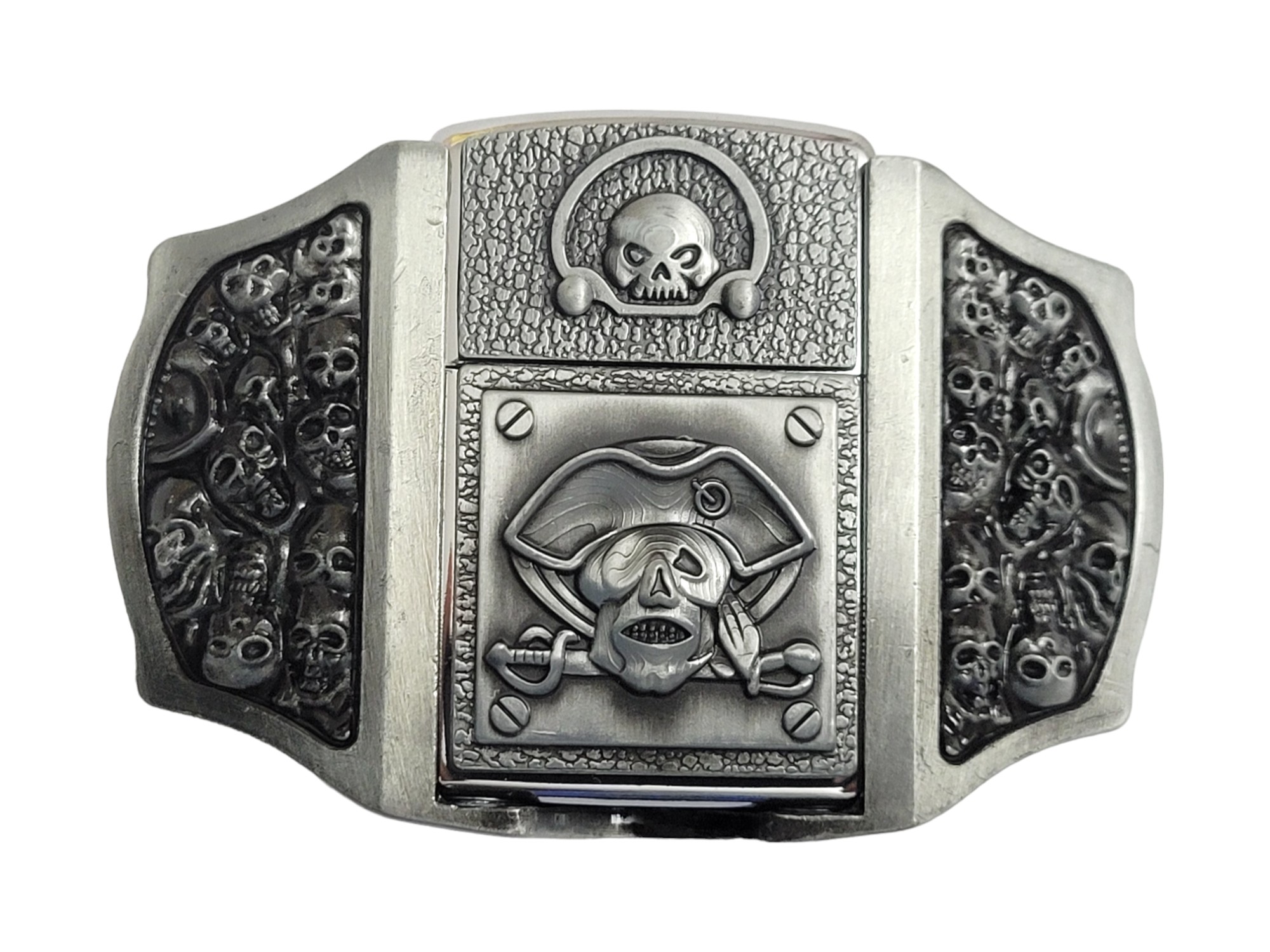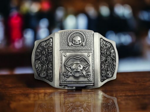Introducing the Antique Silver Finish Pirate Skulls Lighter Belt Buckle Holder—a perfect blend of style and functionality. Crafted from high-quality zinc alloy, this belt buckle comes with a brass-finish lighter that fits discreetly into the buckle for a practical, stylish accessory.