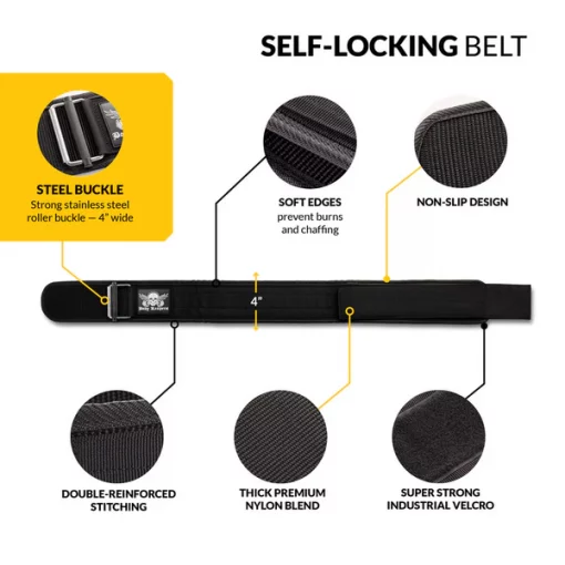 The Body Reapers Self-Locking Weightlifting Belt features an innovative self-locking mechanism for a secure, snug fit. Reinforced with durable nylon webbing and a wide back panel, it provides enhanced support and comfort during heavy lifts.