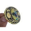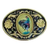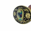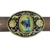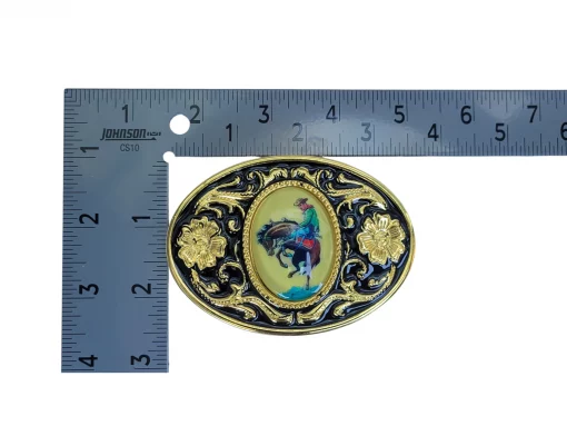 This Western-style belt buckle showcases a detailed cowboy riding a bronco at the center. Gold and black enamel floral patterns surround the design, adding a bold touch. Perfect for 1.5-inch Snap-On belts or belts with Chicago screws, this buckle makes a strong statement.