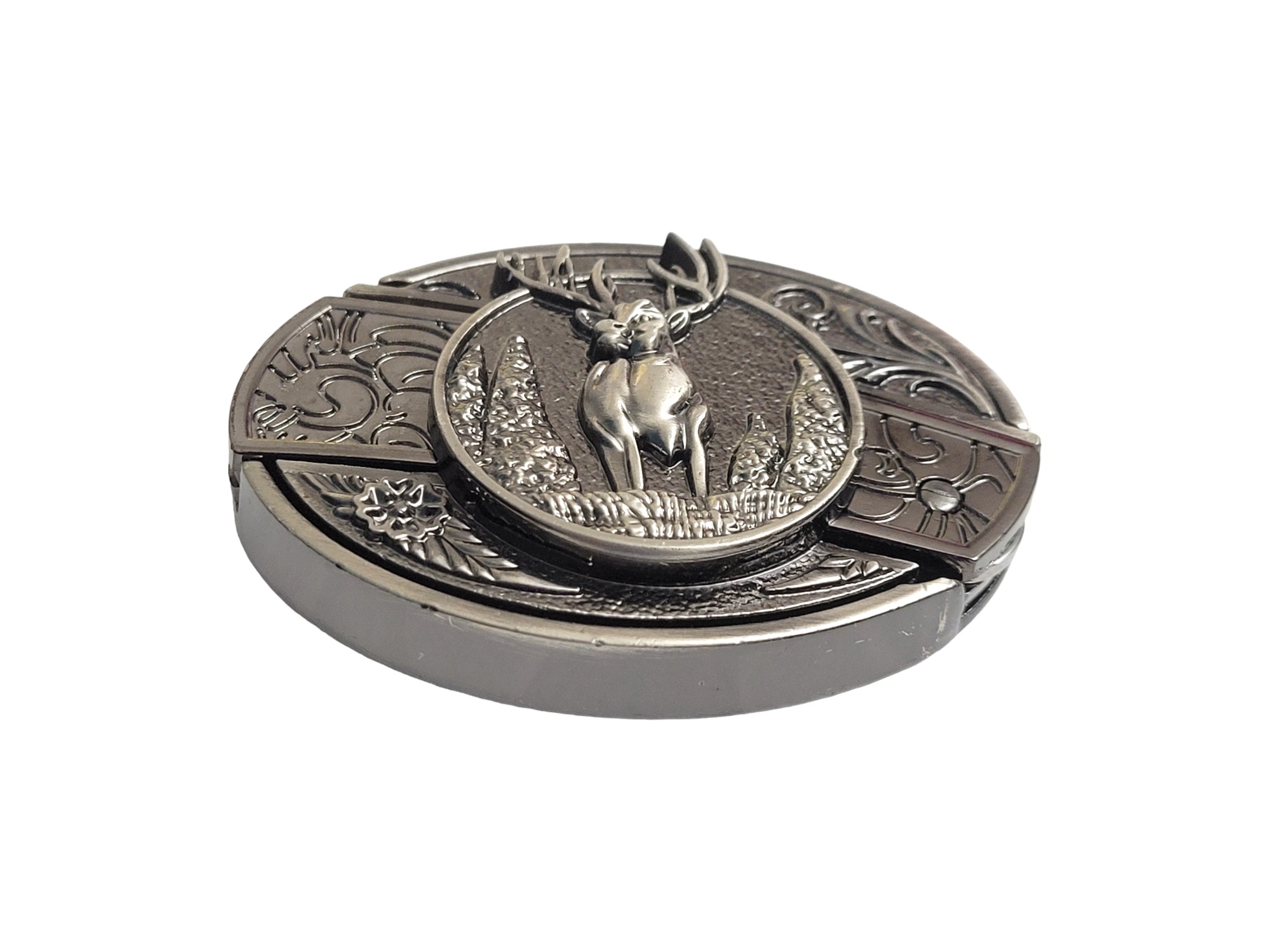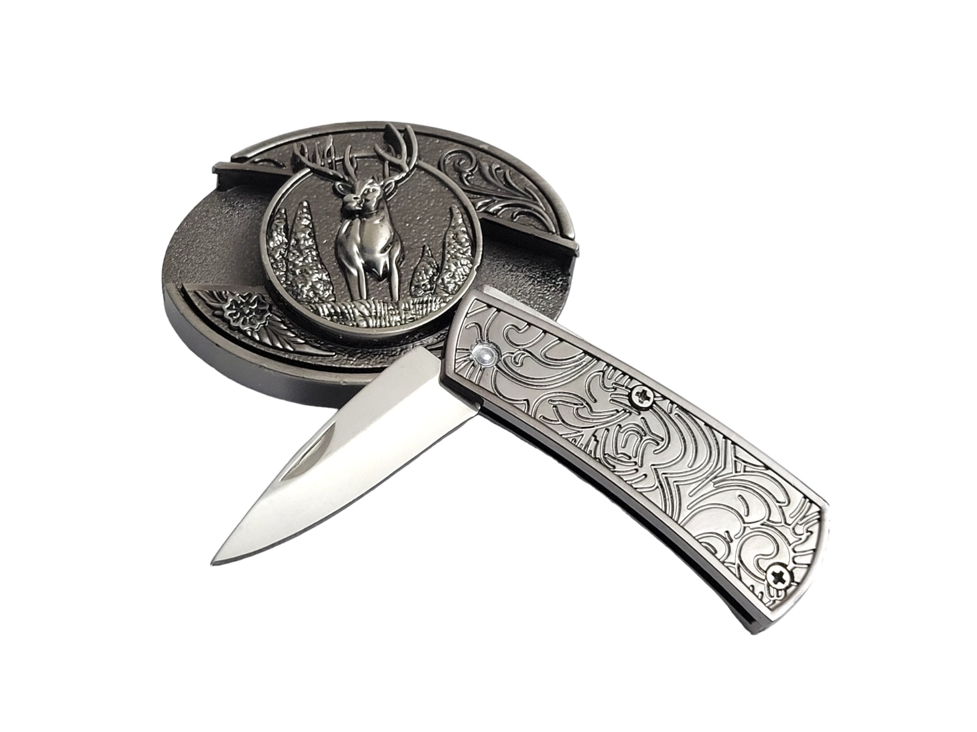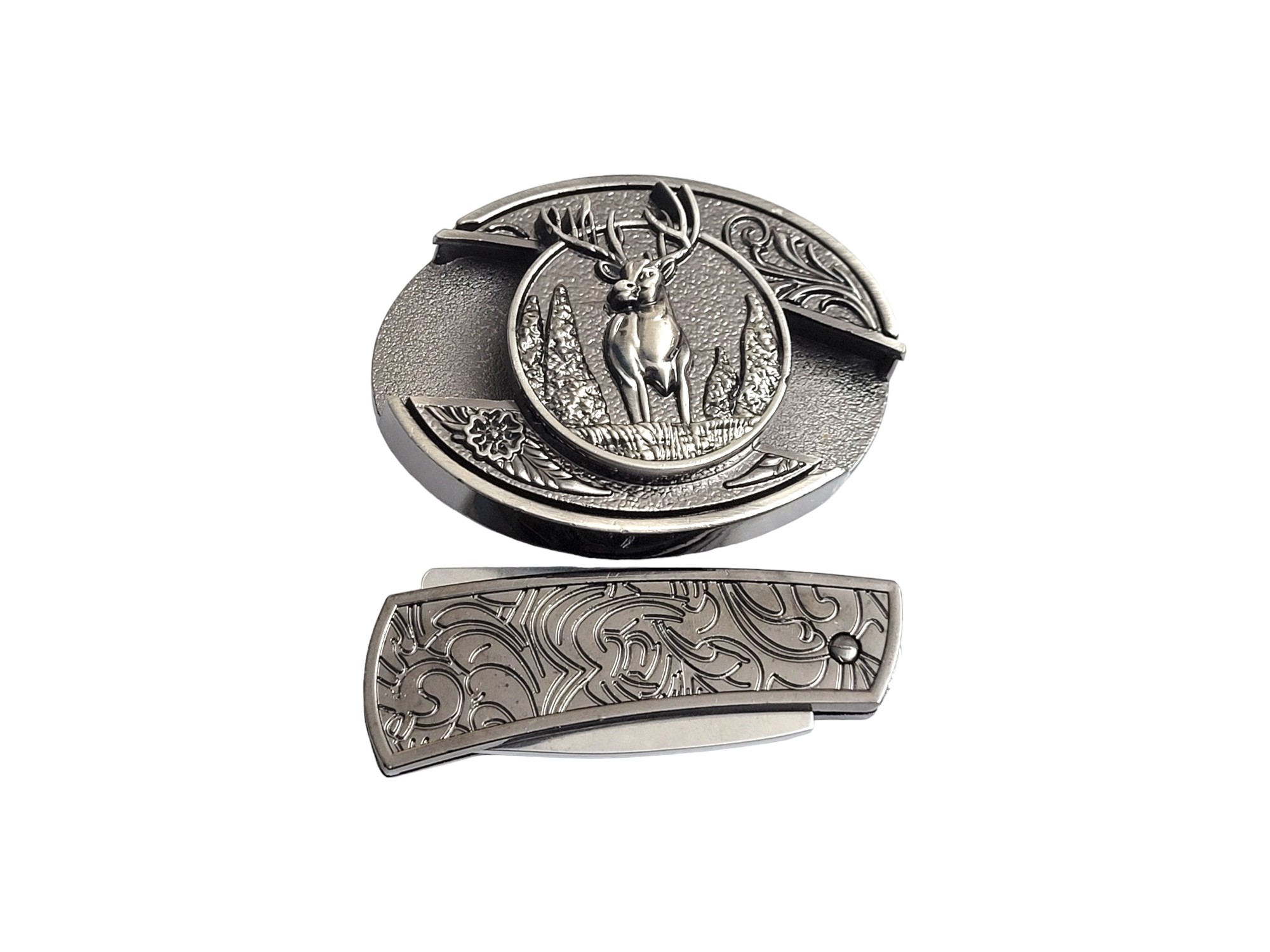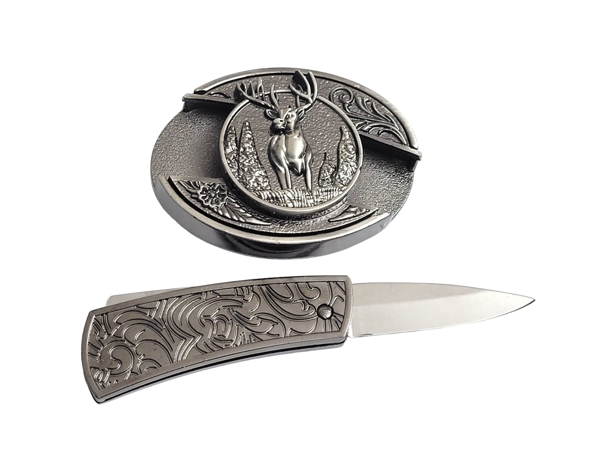 Introducing the 3D Deer with Antlers Folding Knife Belt Buckle, a stylish accessory featuring a practical folding knife, ideal for outdoor activities. Enjoy free laser engraving for personalization!