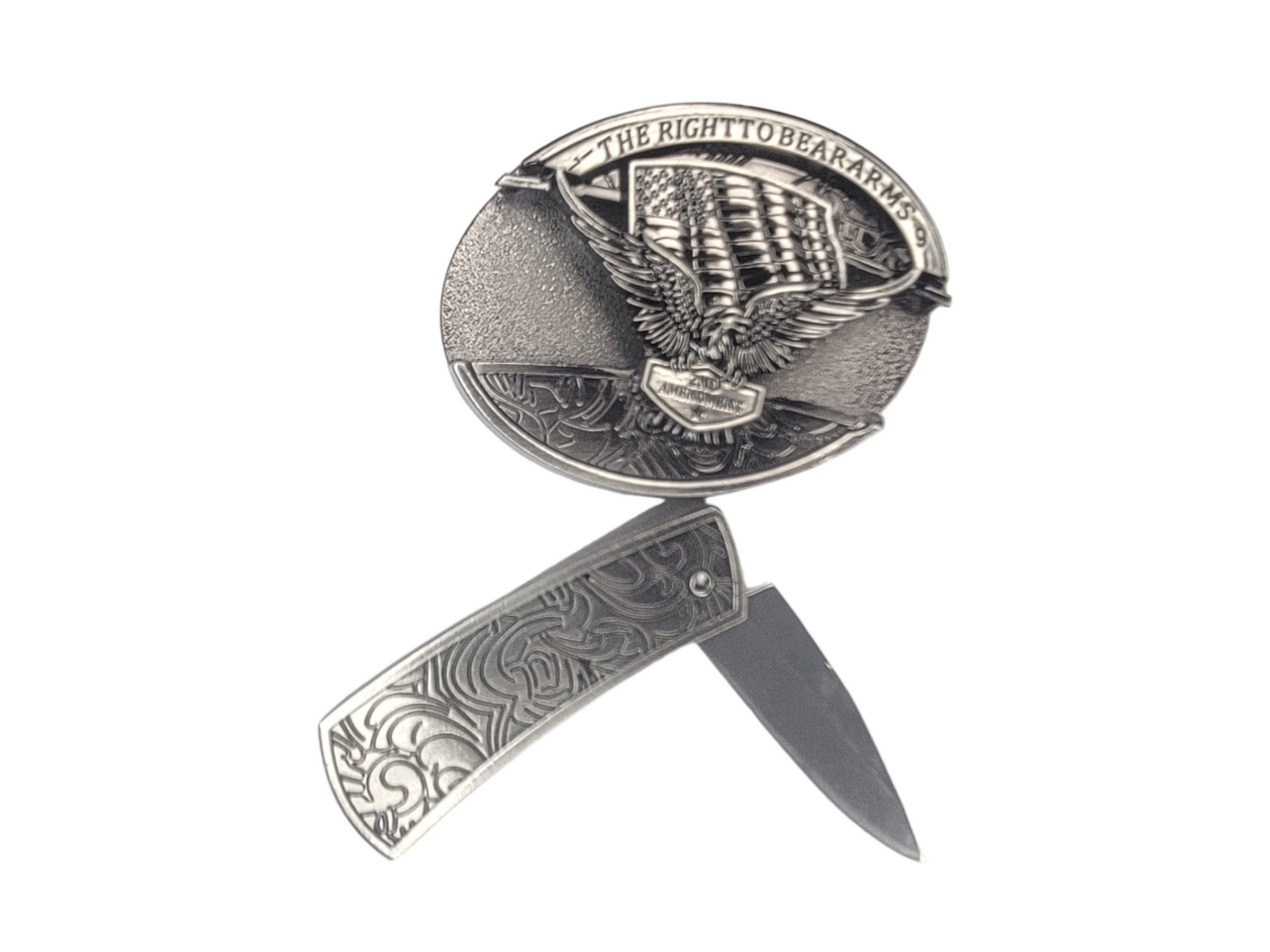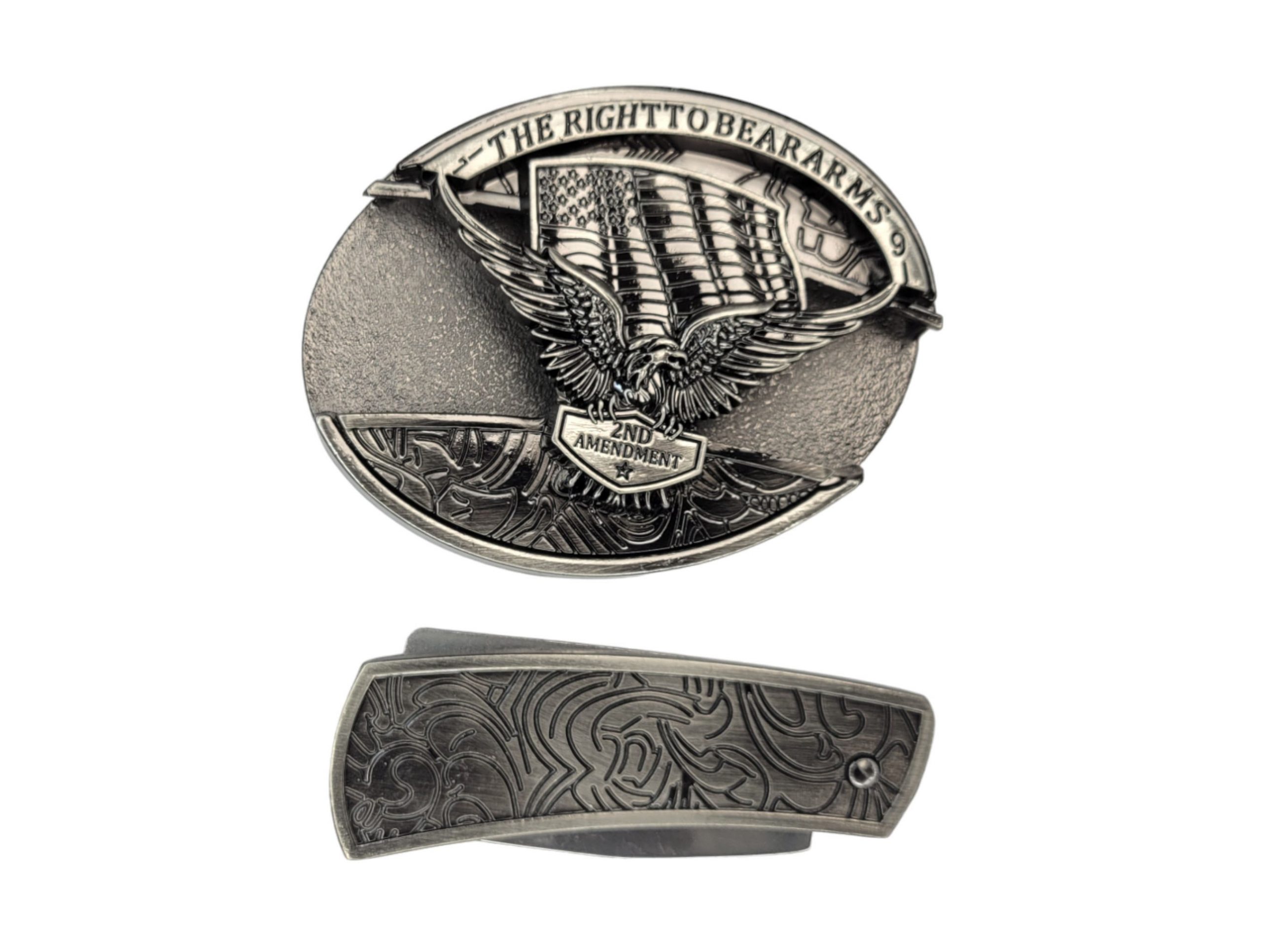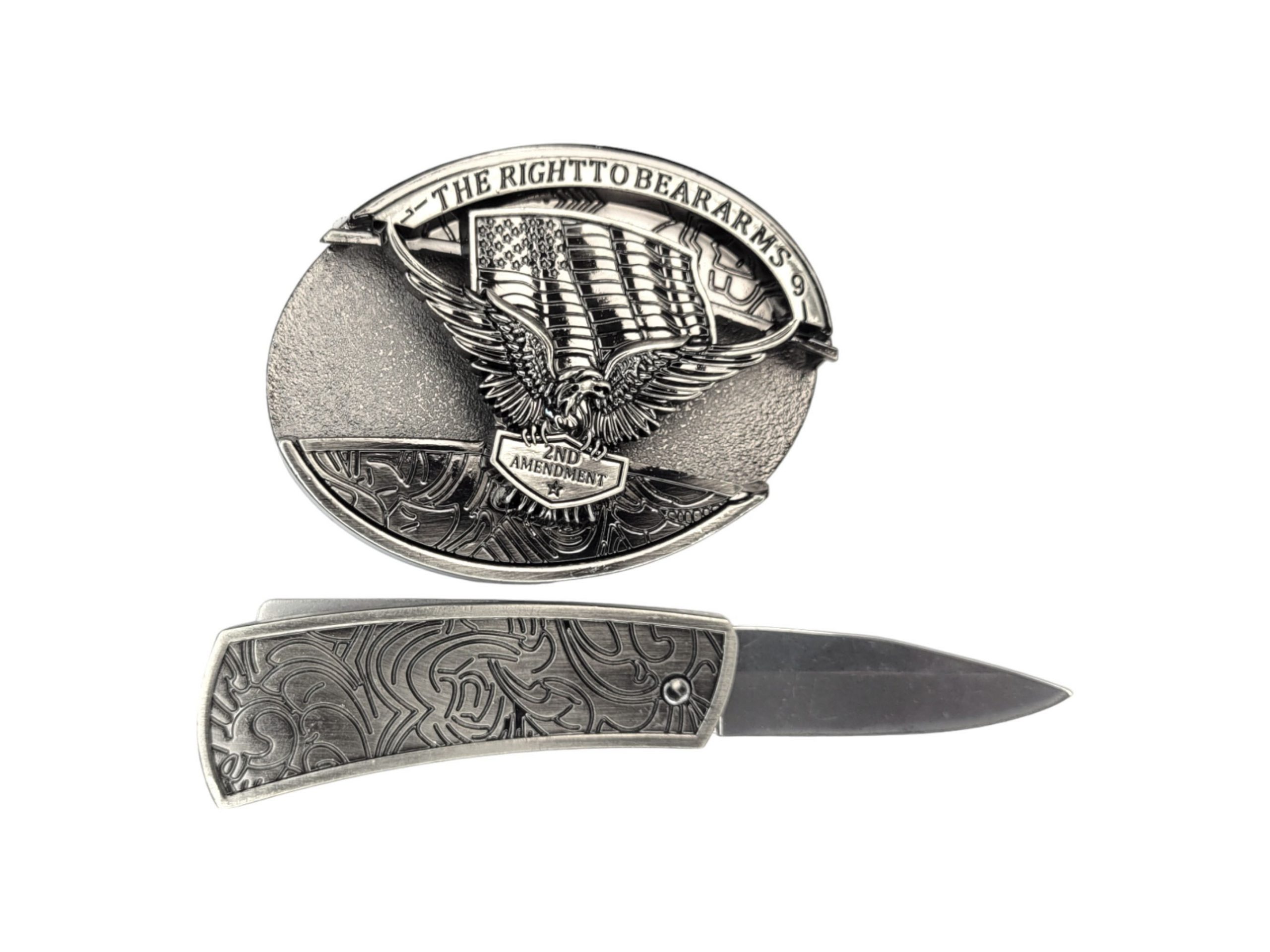 Introducing our stylish Folding Knife Belt Buckle, featuring a stunning 3D Soaring Eagle & American Flag design on a vintage silver finish. This buckle not only secures your pants but also houses a convenient folding pocket knife in the front, making it a perfect blend of style and practicality. Plus, enjoy the exclusive offer of 🎉 complimentary laser engraving 🎉 on the knife!