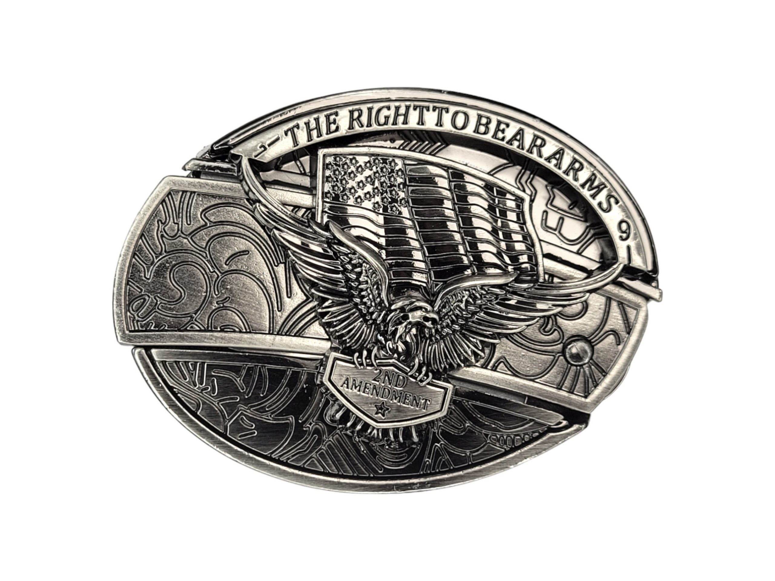 - Eye-catching 3D Soaring Eagle & American Flag prominently displayed on the buckle