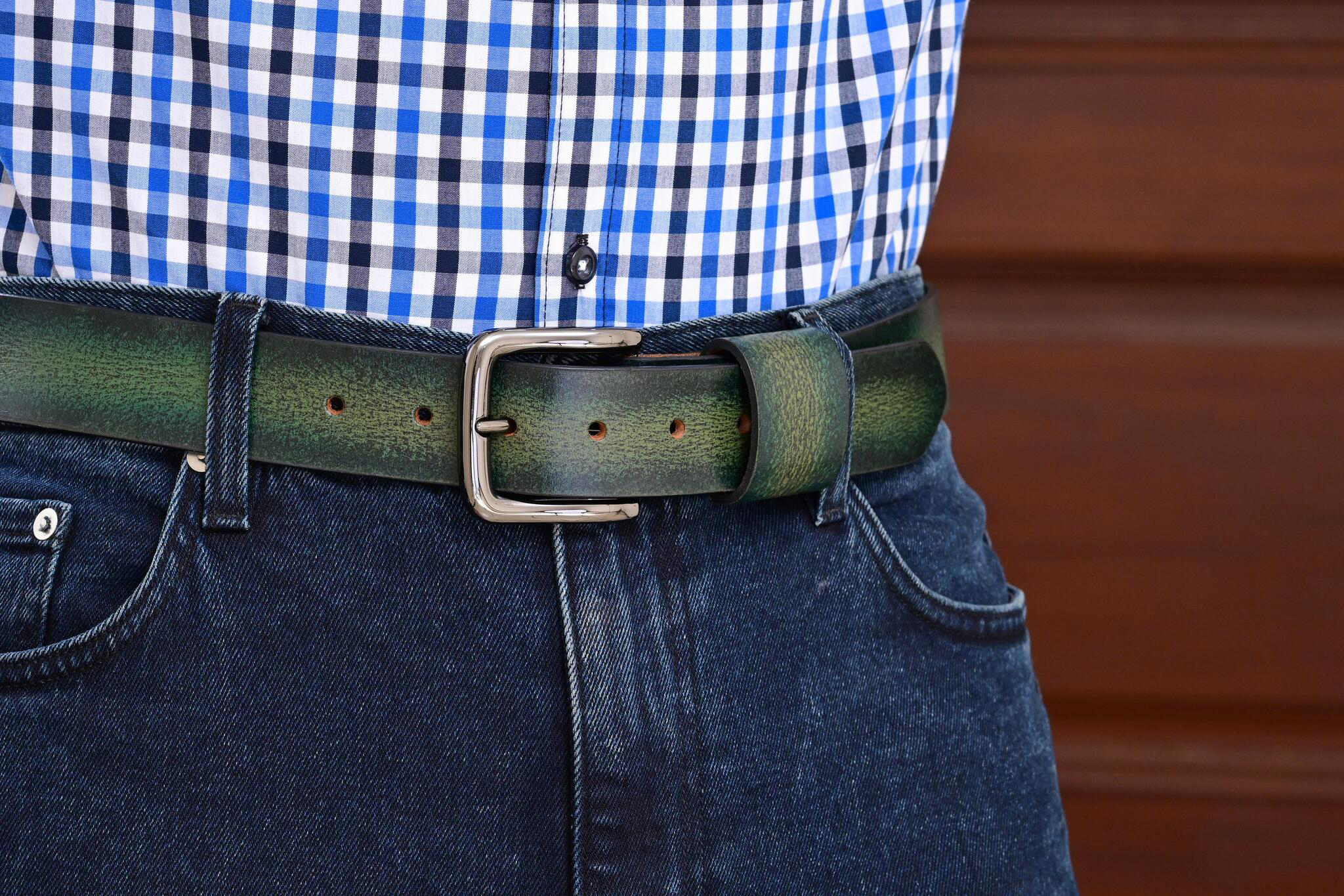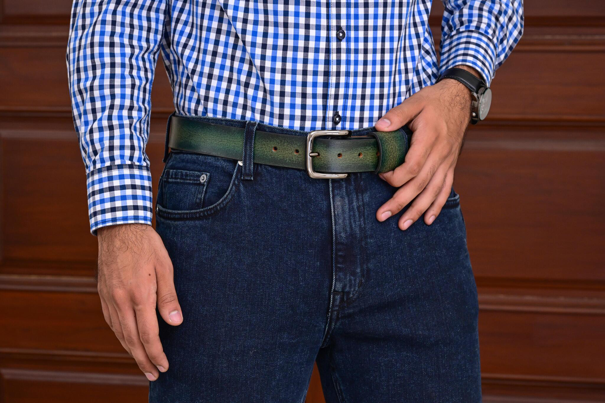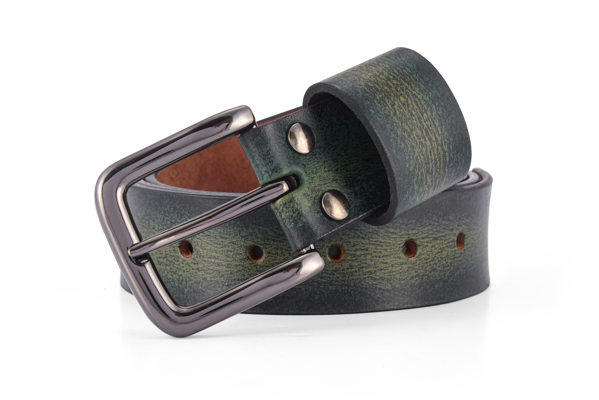 This forest green vintage leather belt is crafted from premium full-grain buffalo leather, offering durability and timeless style. Customize it with engraving for a personal touch.