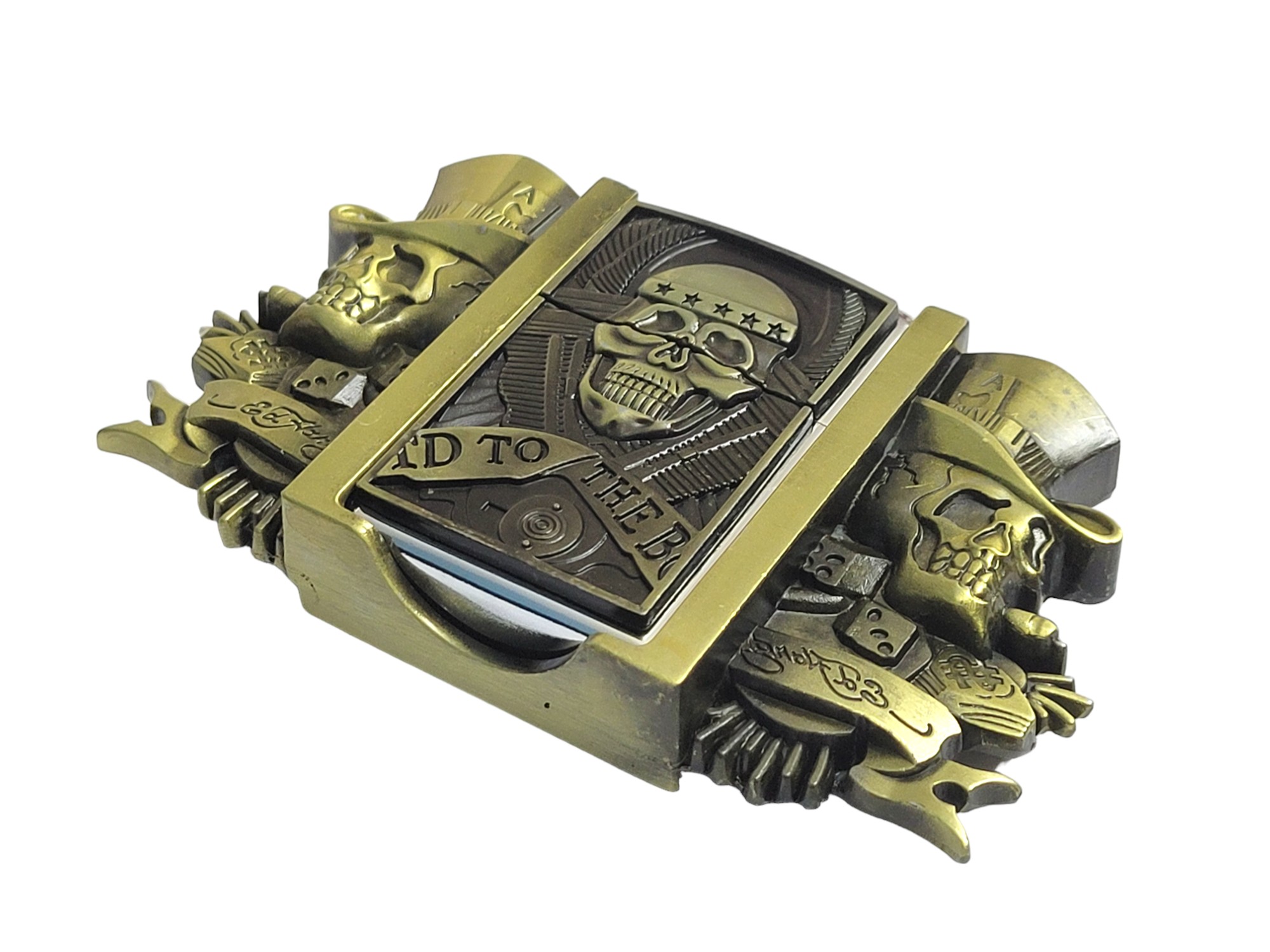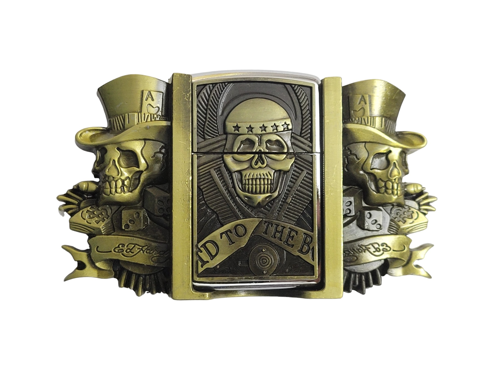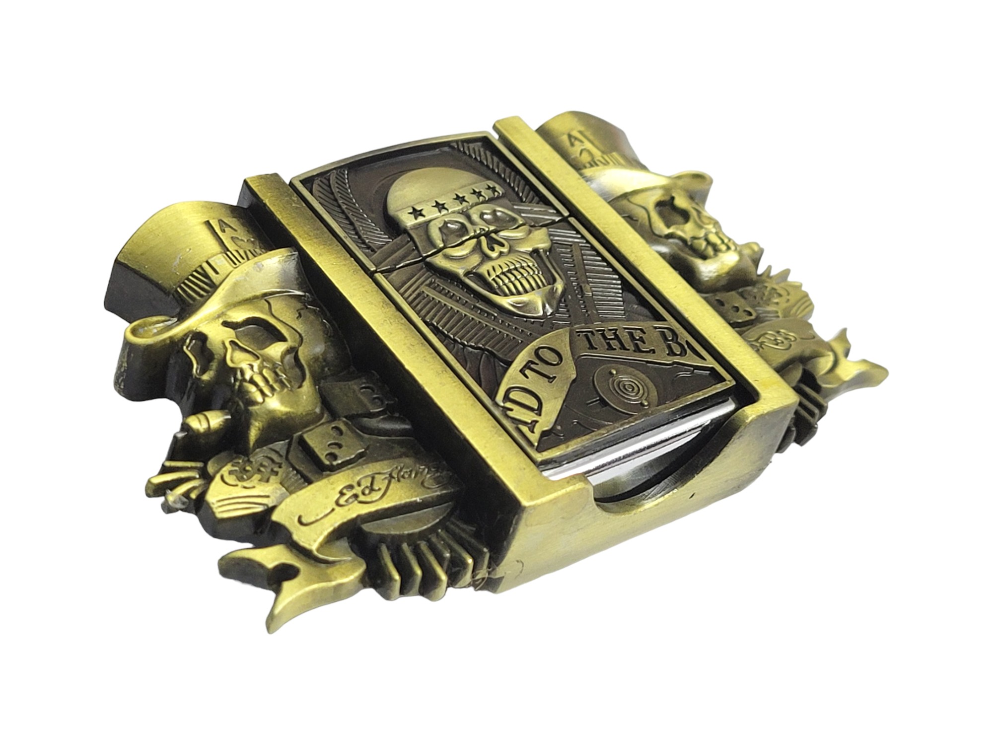 The Gambler Skulls With Hats Bronze Finish Belt Buckle combines style and functionality seamlessly. Crafted from durable zinc alloy, this eye-catching buckle features intricate skull designs wearing hats and includes a brass-finish lighter that fits perfectly within the buckle for easy access.