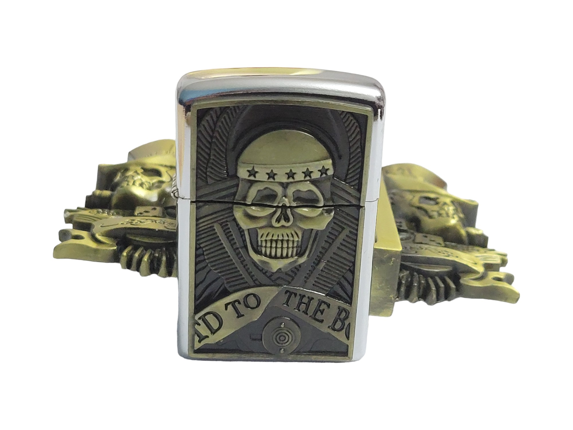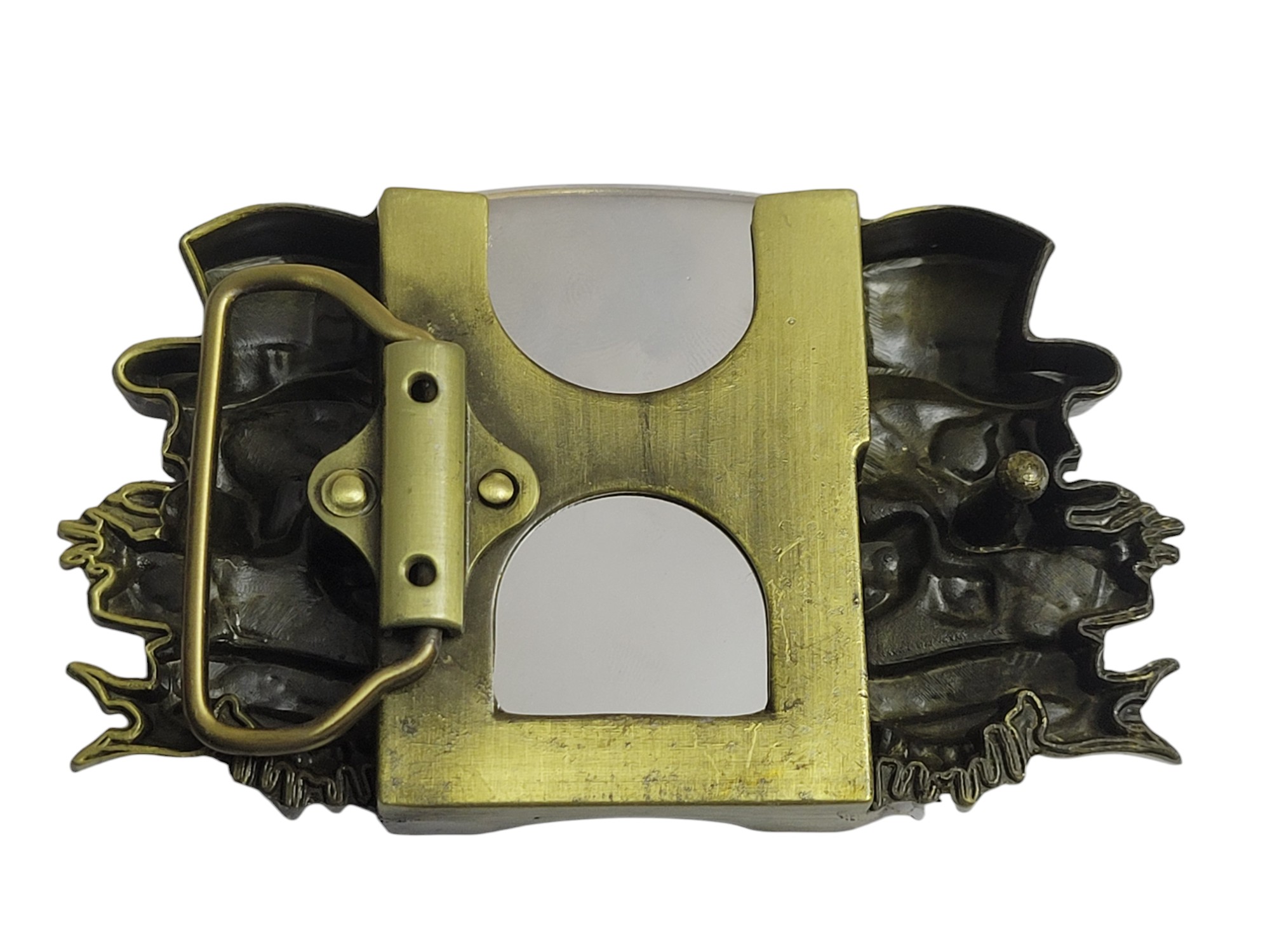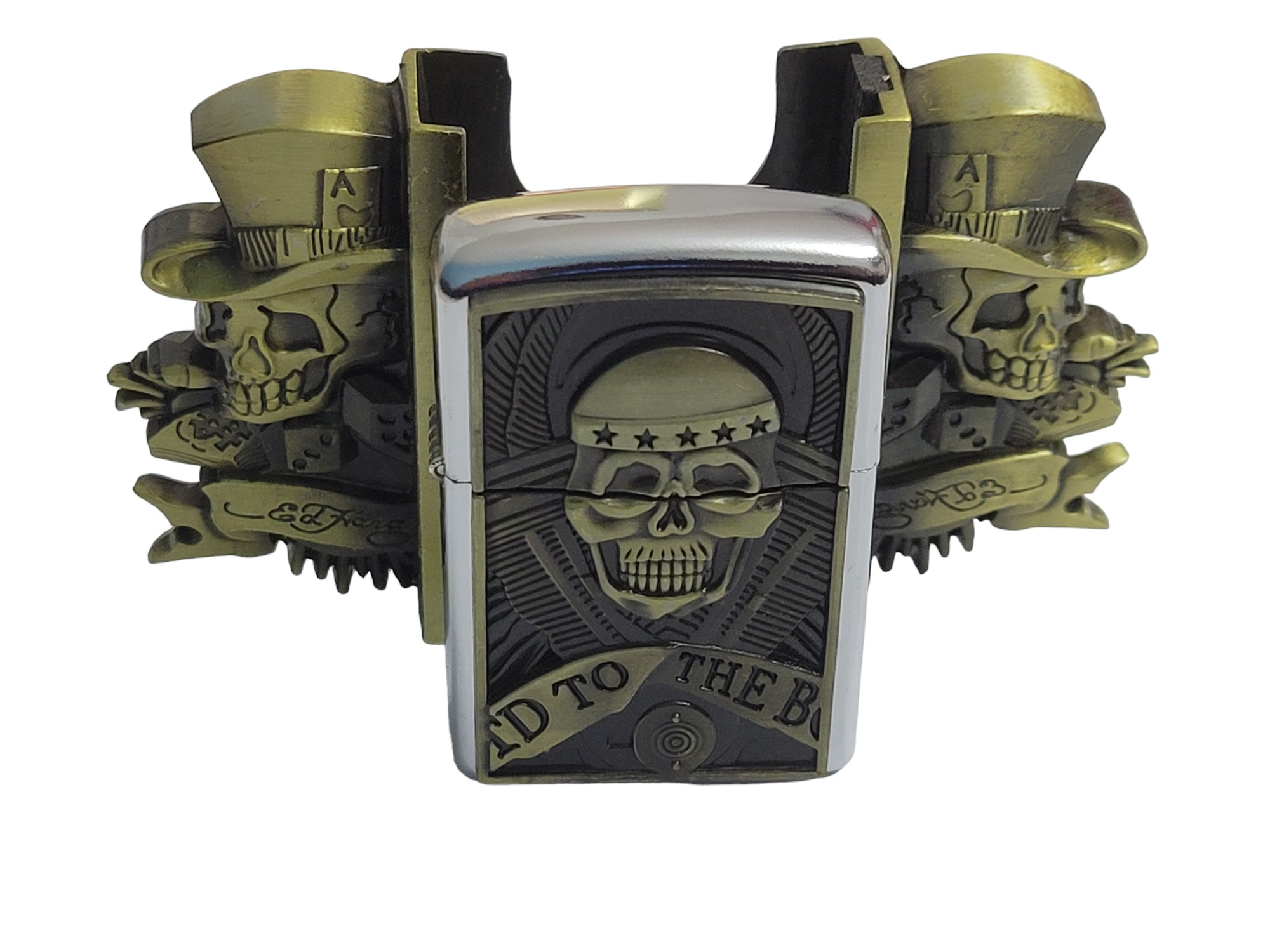 The Gambler Skulls With Hats Bronze Finish Belt Buckle combines style and functionality seamlessly. Crafted from durable zinc alloy, this eye-catching buckle features intricate skull designs wearing hats and includes a brass-finish lighter that fits perfectly within the buckle for easy access.