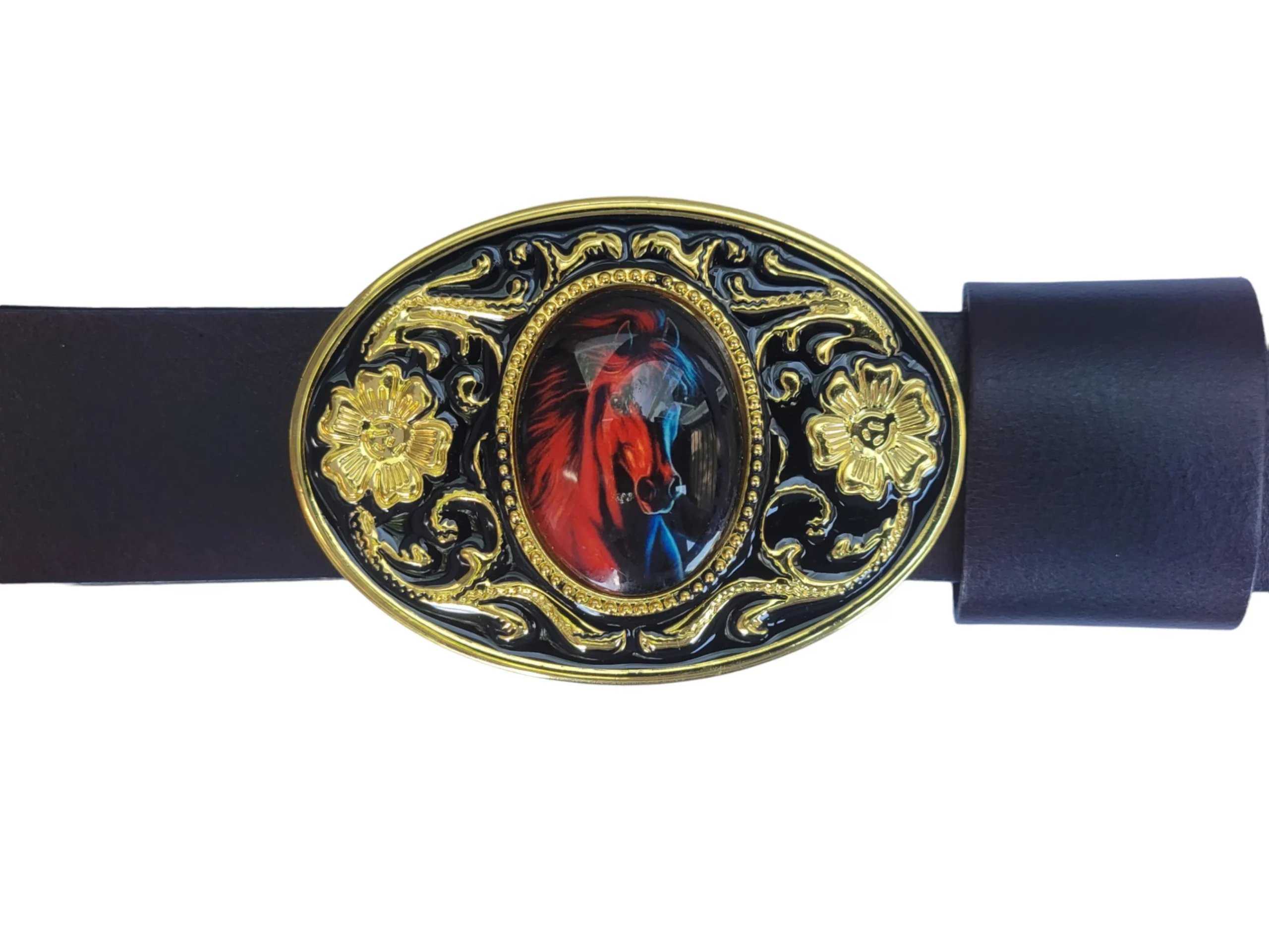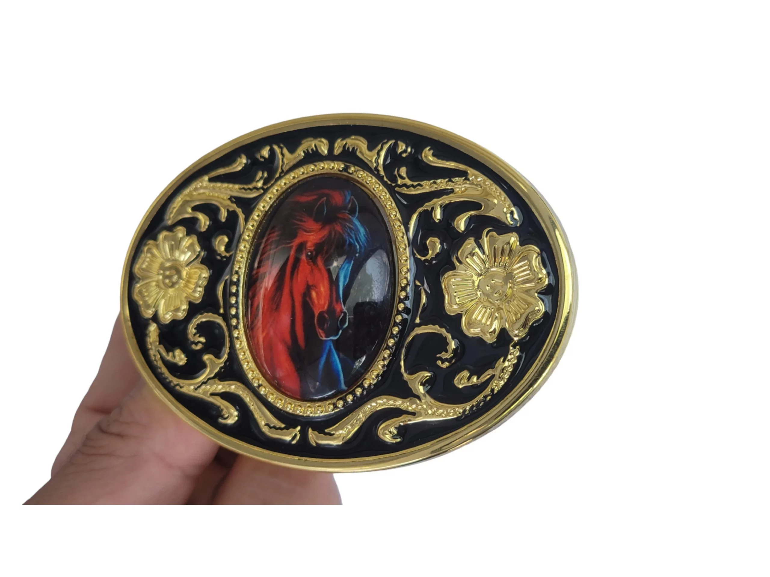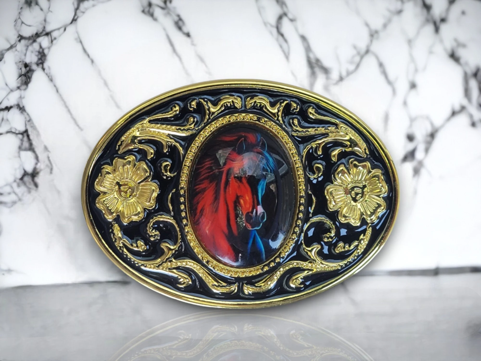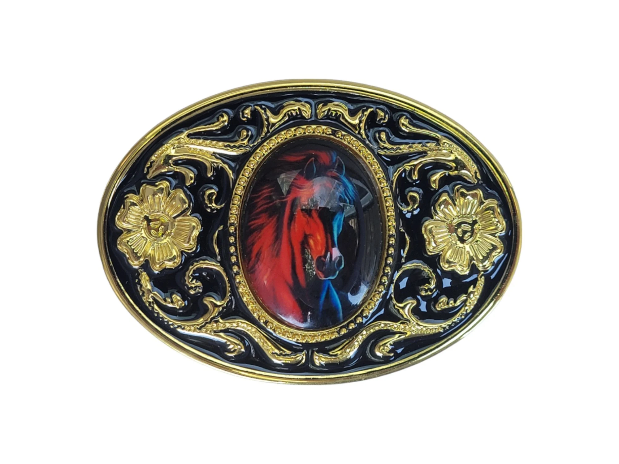 This Western-style belt buckle showcases a detailed horse head at the center, surrounded by gold and black enamel floral patterns. Designed for 1.5-inch Snap-On belts or belts with Chicago screws, it adds a bold and stylish touch to any outfit.