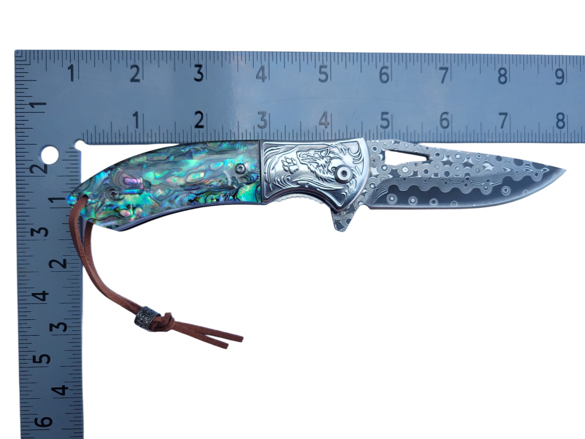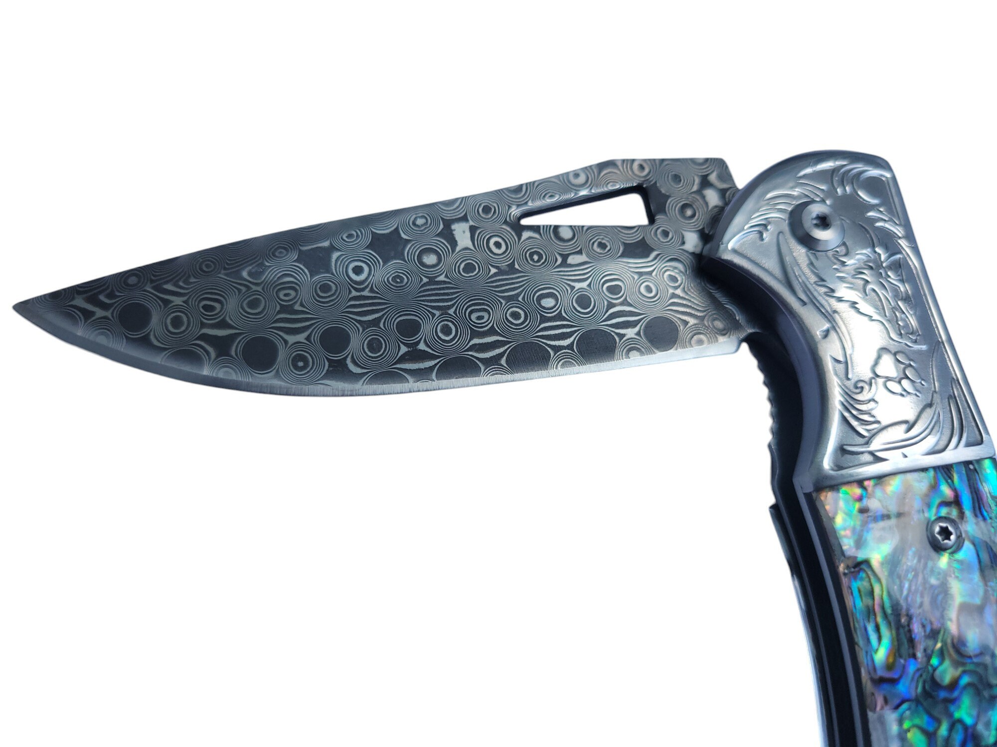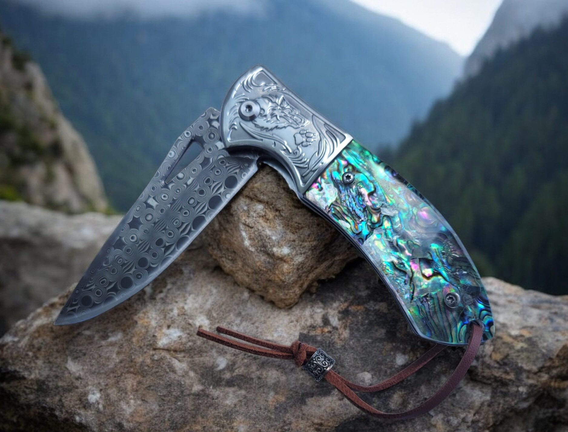 Premium Engraved Damascus Steel VG10 Folding Knife with Abalone Shell Handle – Unrivaled Craftsmanship and Performance