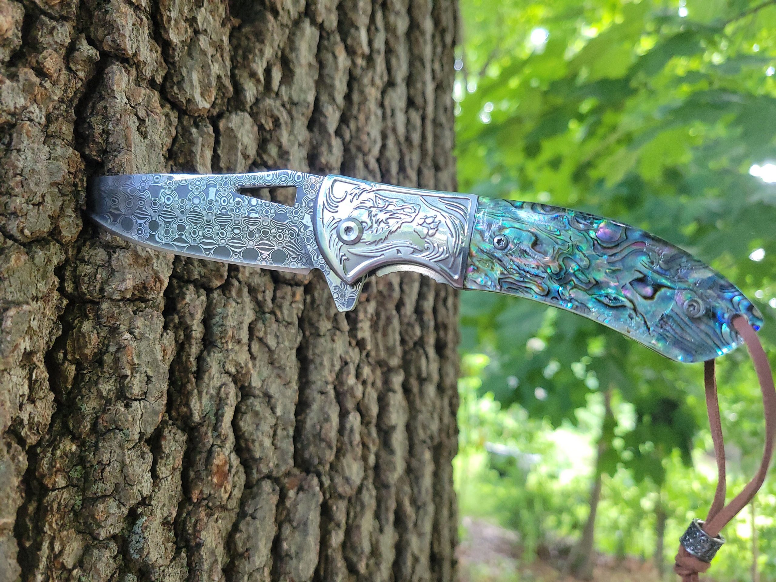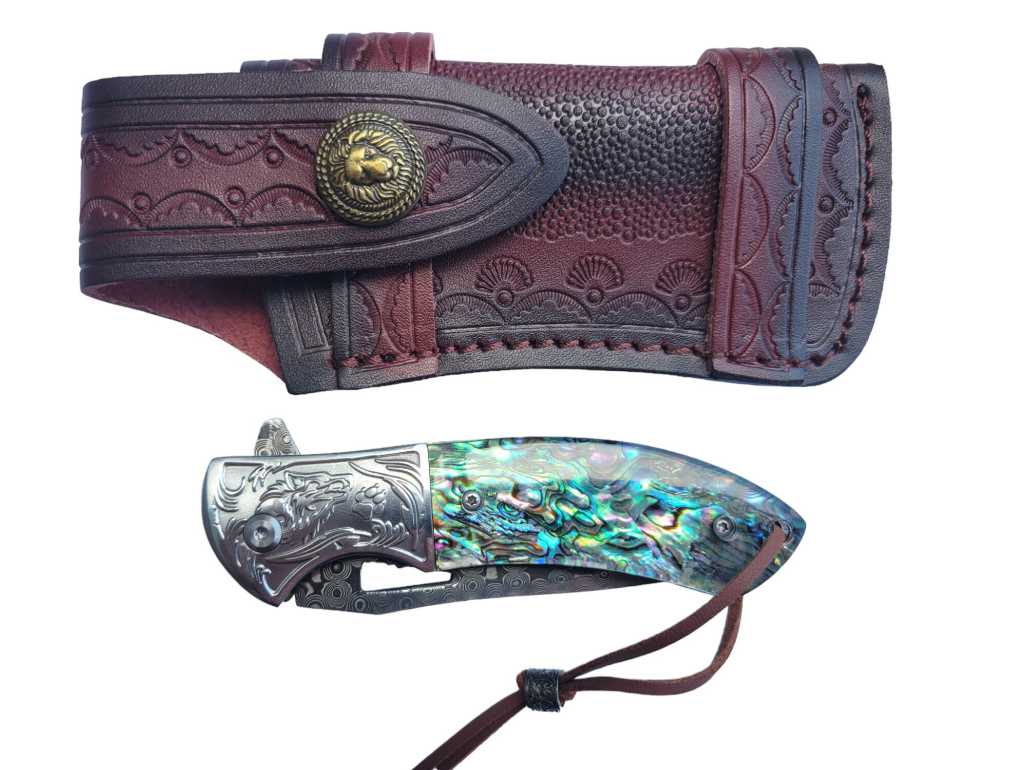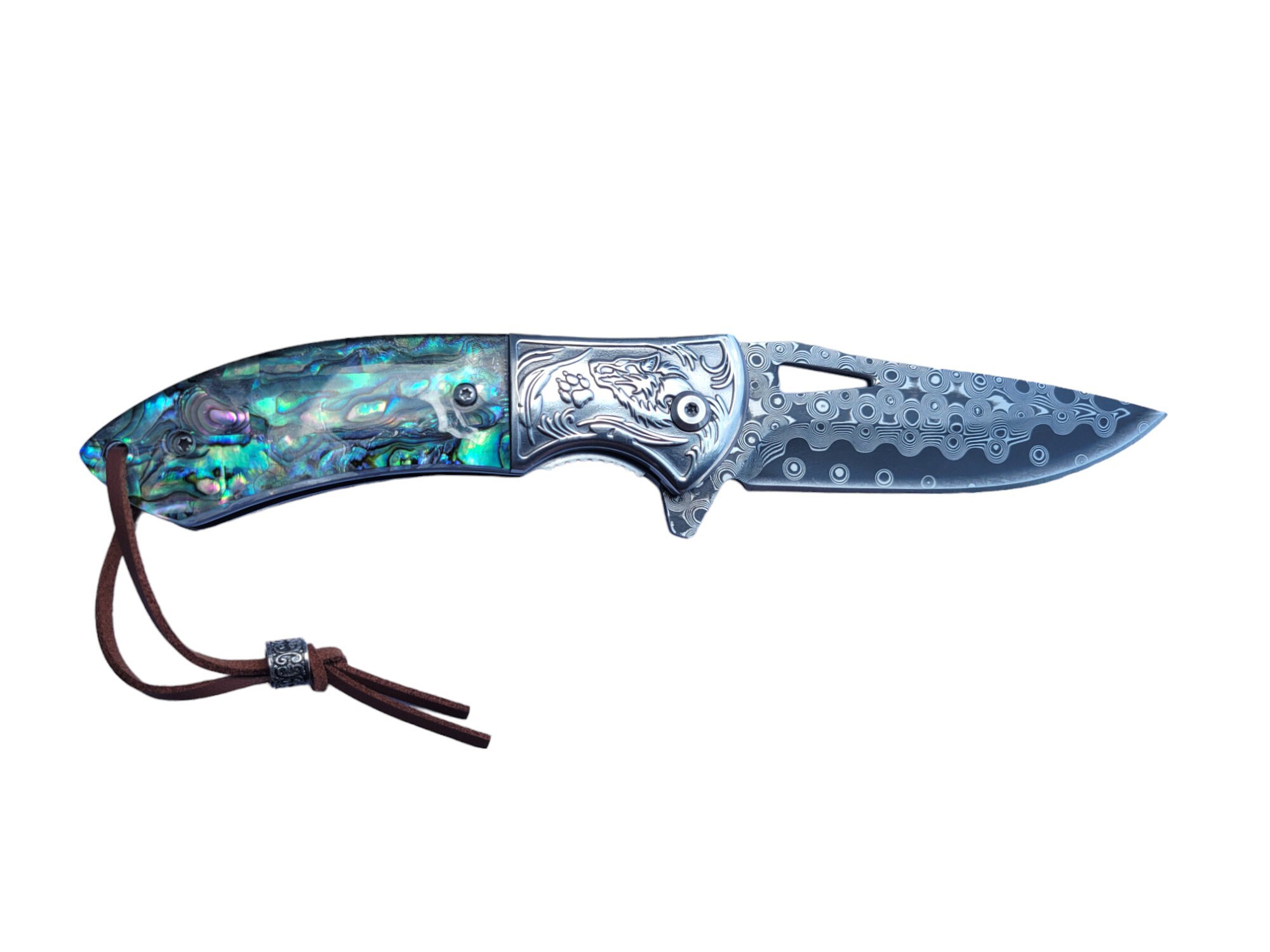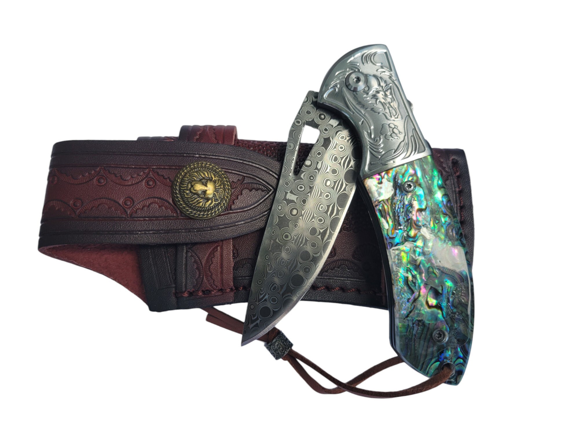 Premium Engraved Damascus Steel VG10 Folding Knife with Abalone Shell Handle – Unrivaled Craftsmanship and Performance
