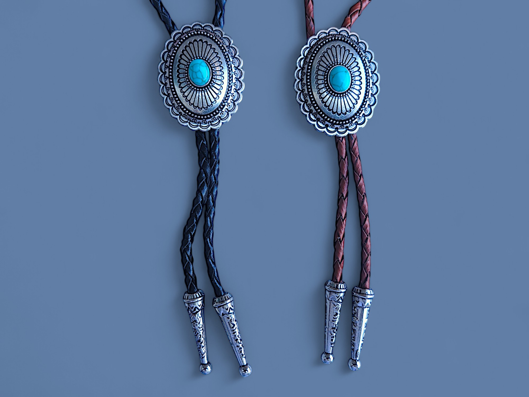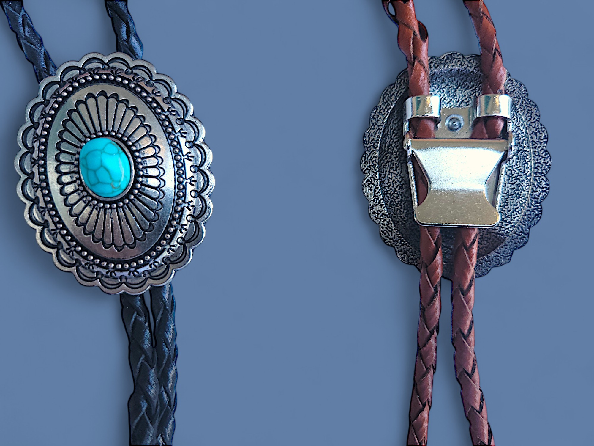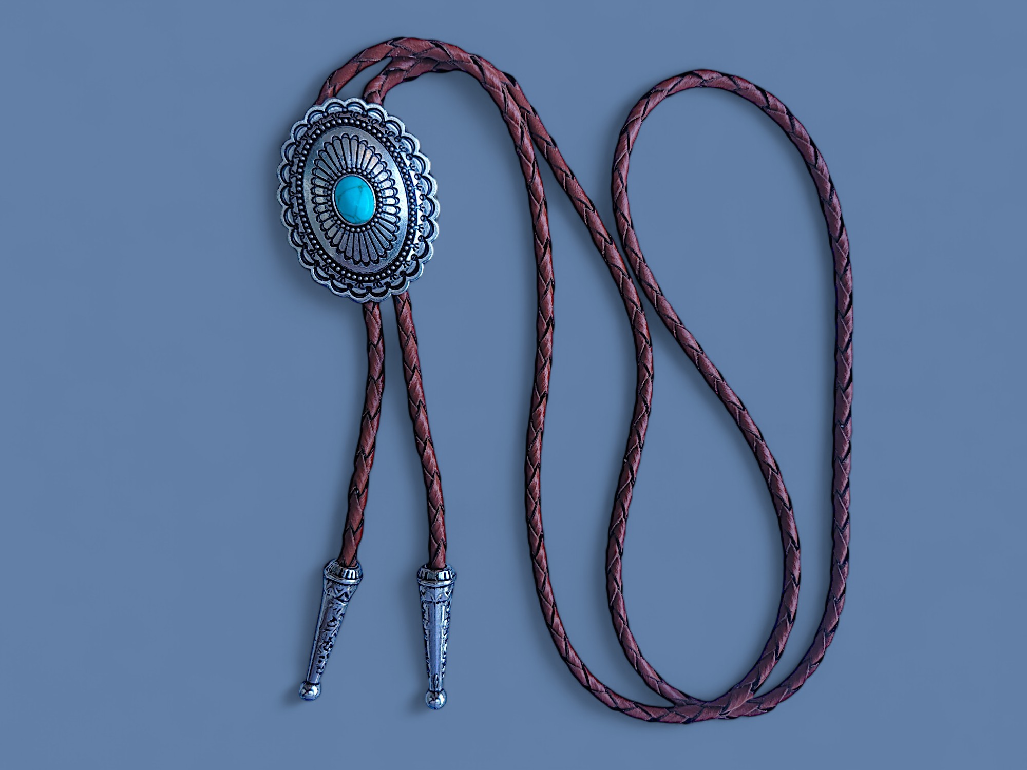 Make a statement with this Southwestern bolo tie featuring a large silver pendant and smooth turquoise cabochon, finished with braided leather cord.