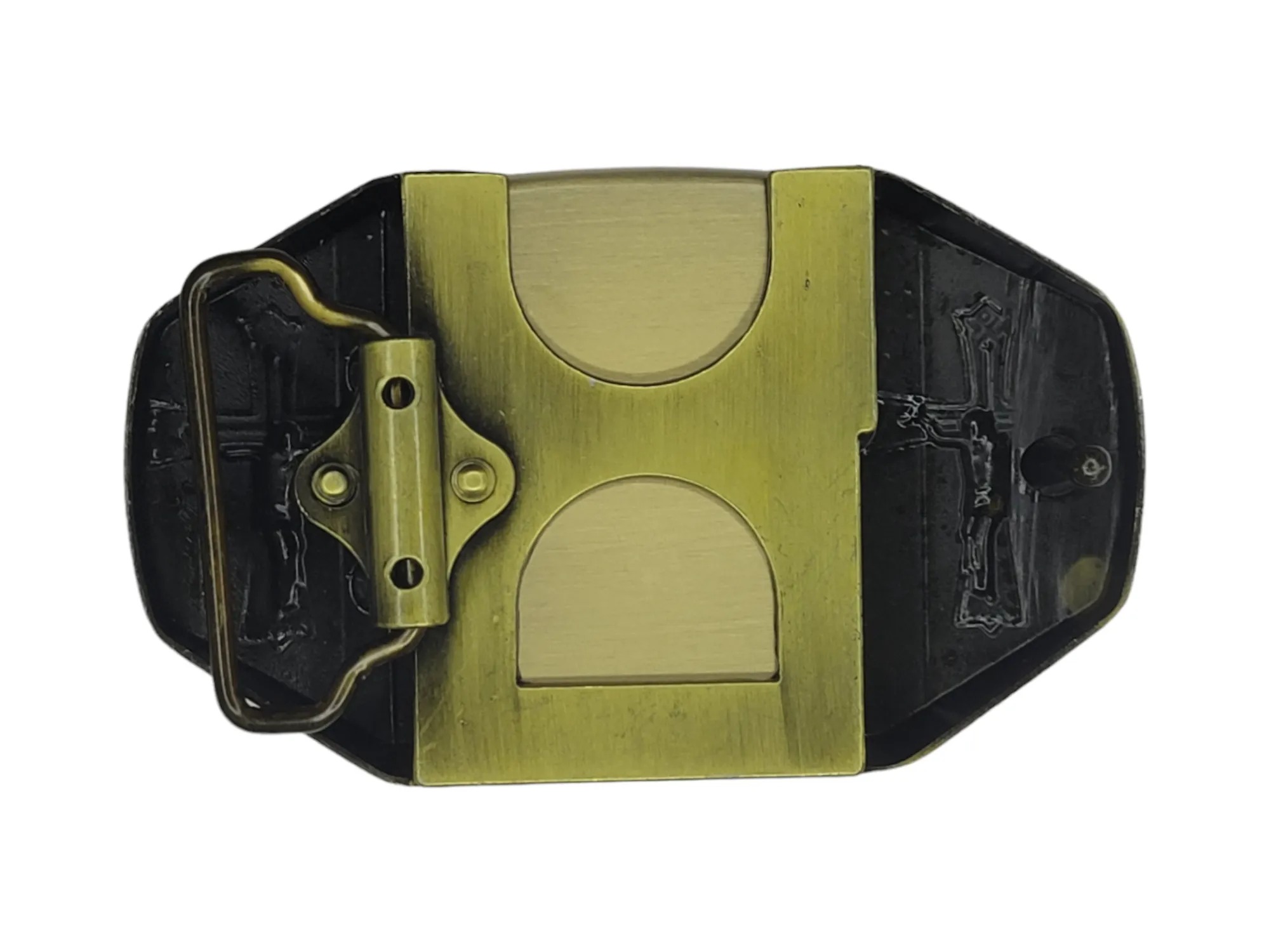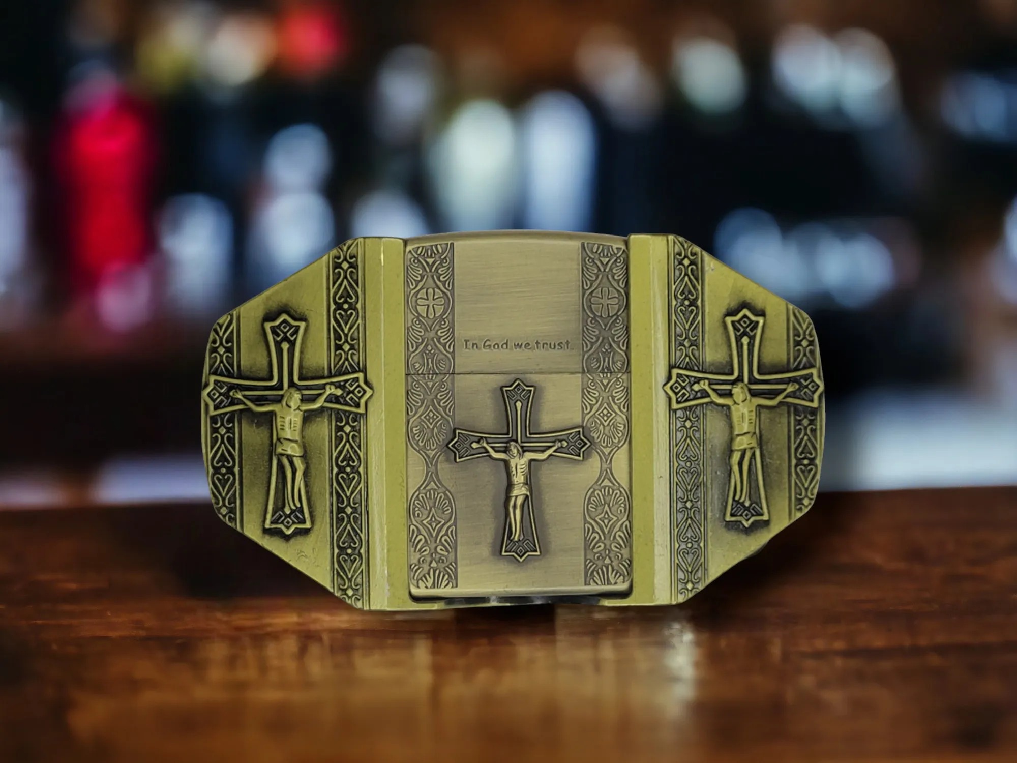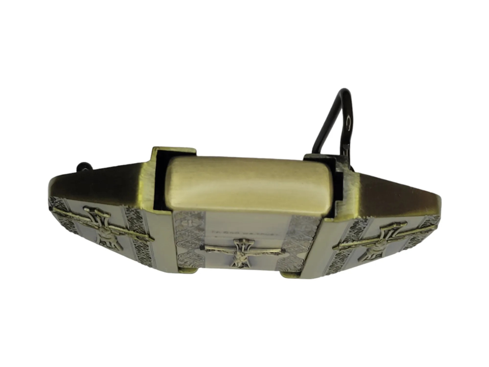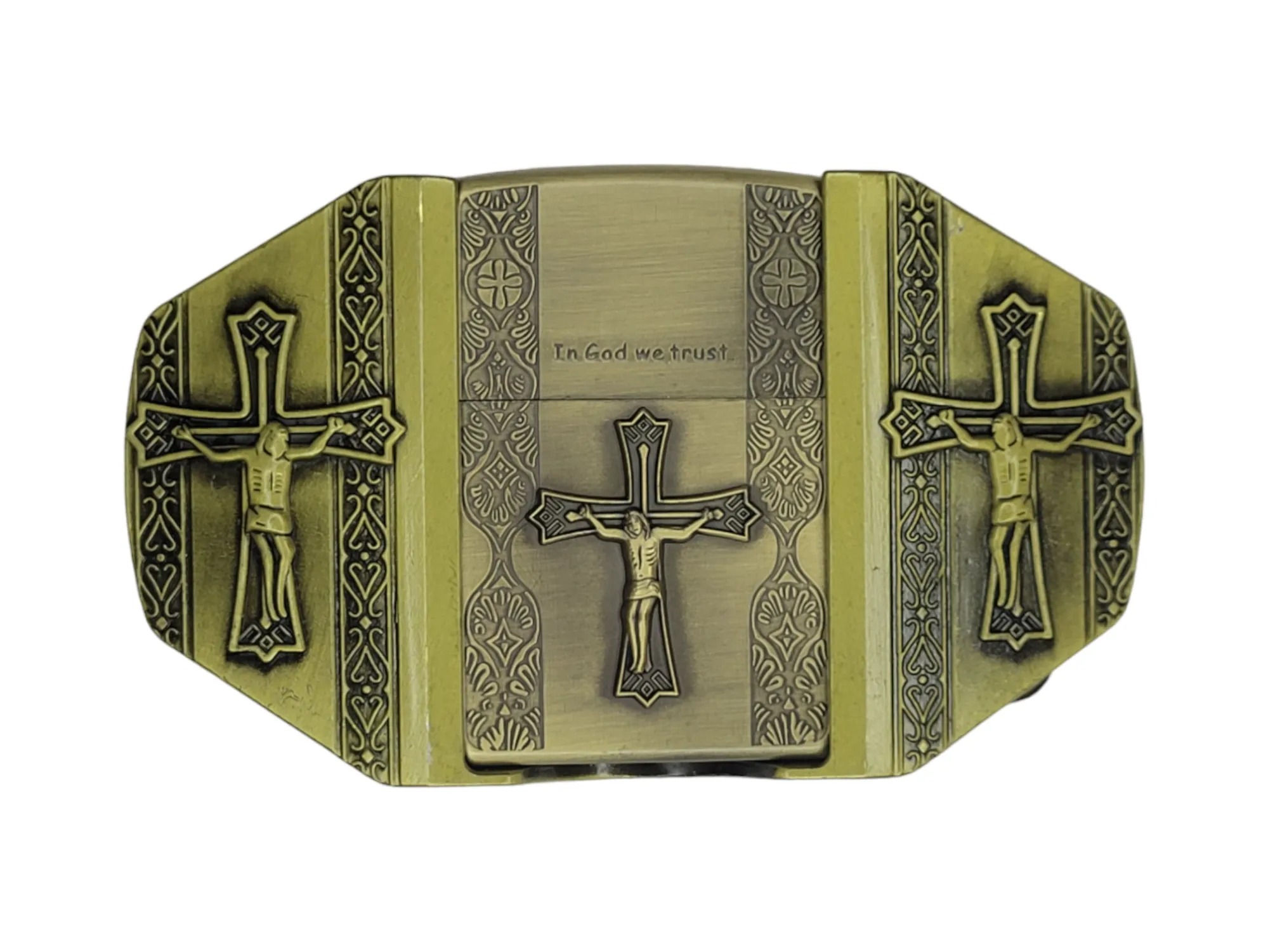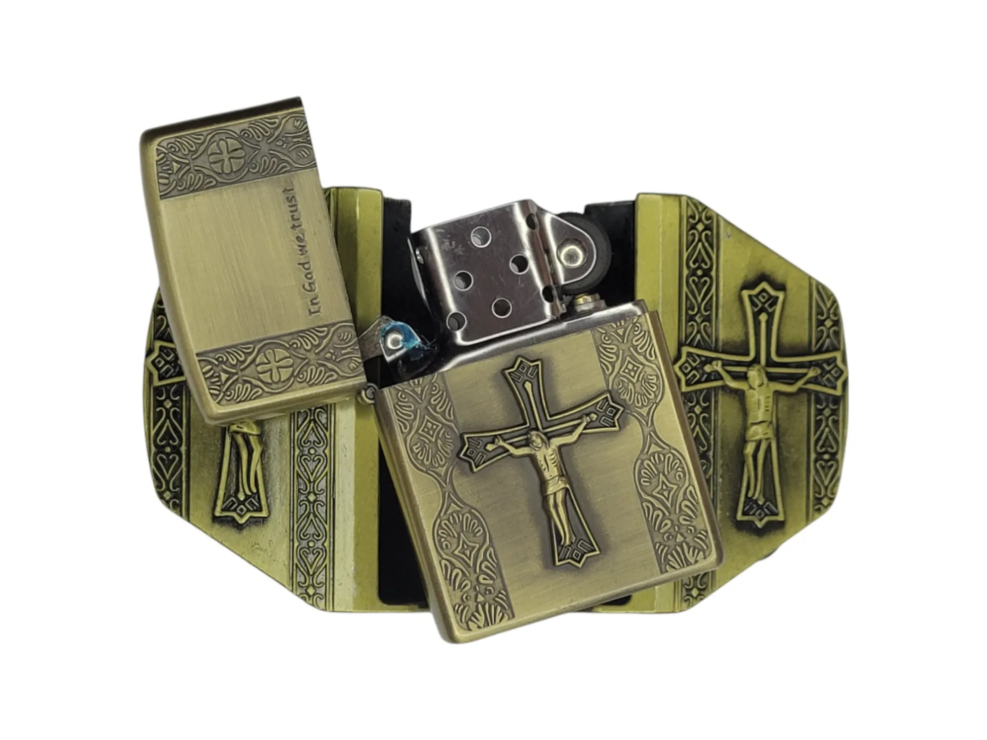 Introducing the 3 Crosses Lighter Belt Buckle Holder with One Cross on Lighter—a versatile accessory that combines both style and practicality. Crafted from high-quality zinc alloy, this belt buckle comes with a brass-finish lighter, perfectly integrated into the buckle for ease and convenience.