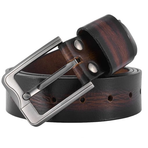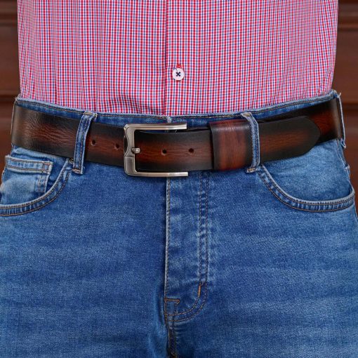This burnt maroon vintage leather belt is made from hand-waxed full-grain leather with a shiny gunmetal silver buckle for a timeless look.