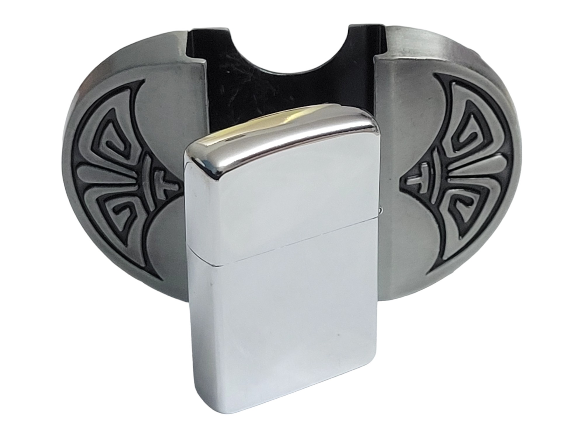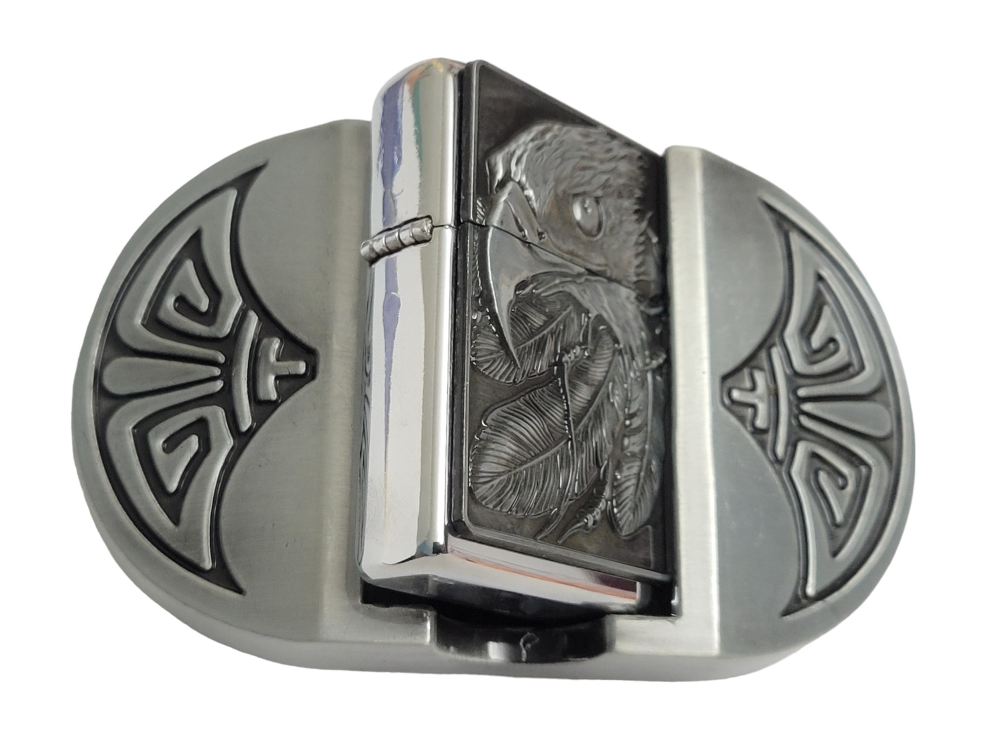 The Vintage Silver Finish Metal Eagle Head Lighter Belt Buckle is a perfect blend of style and functionality. Crafted from premium zinc alloy, this buckle features a striking eagle head design and includes a brass-finish lighter that fits seamlessly within the buckle for easy access.