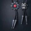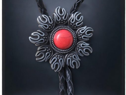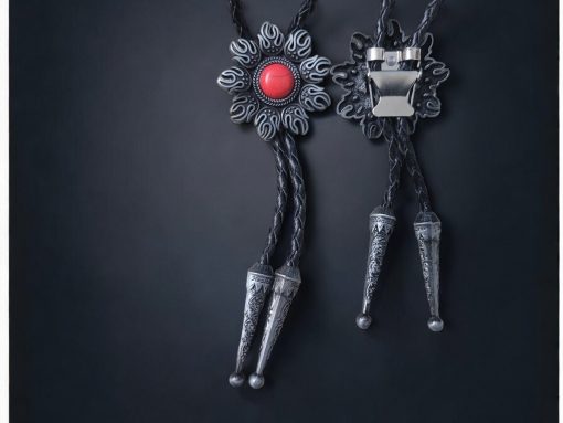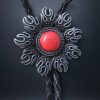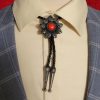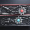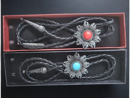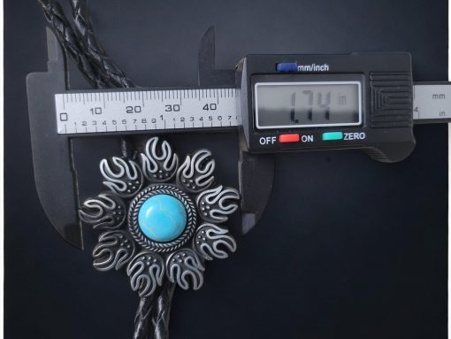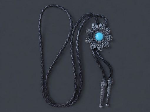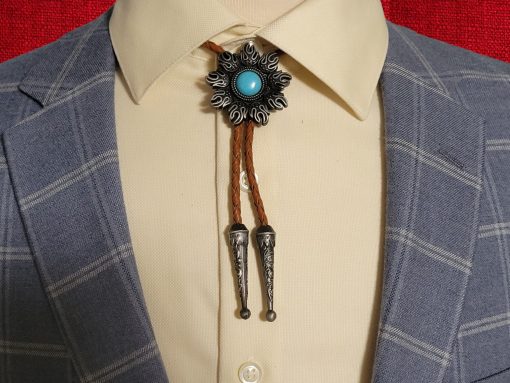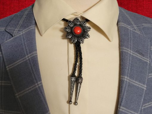 Embrace classic Western aesthetics with this vintage silver flower bolo tie, featuring your choice of Red or Turquoise Stone gemstones and braided leather cord in Black or Brown.