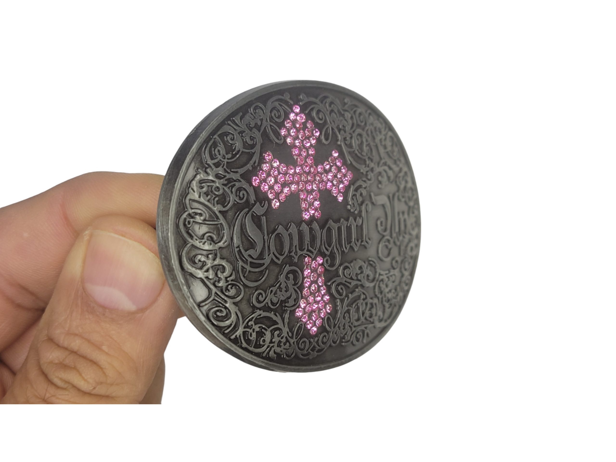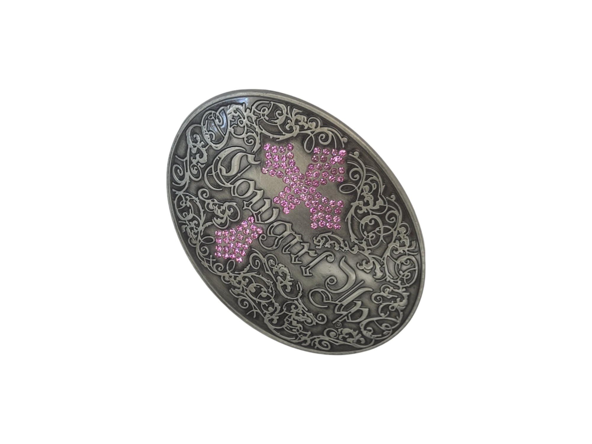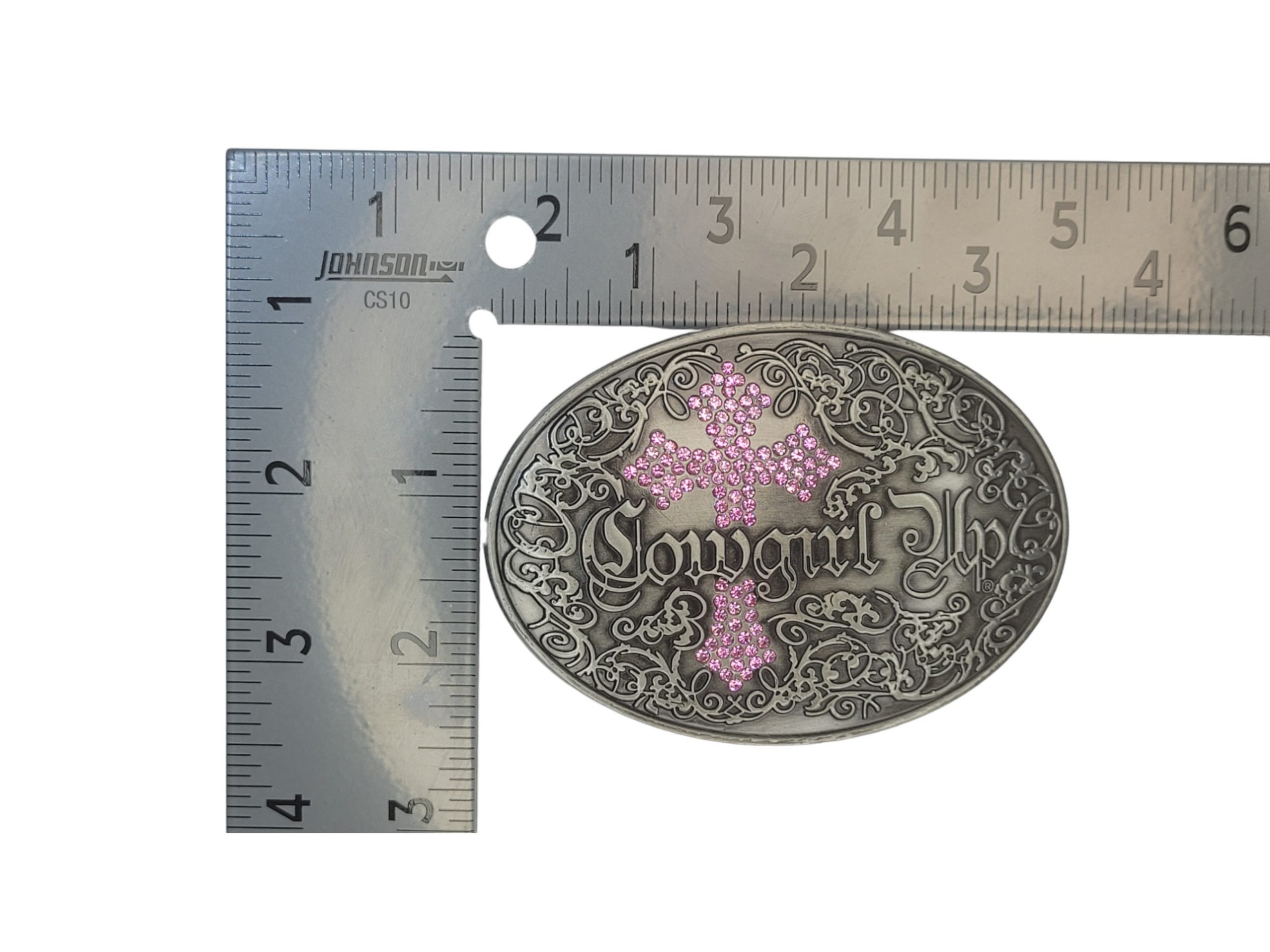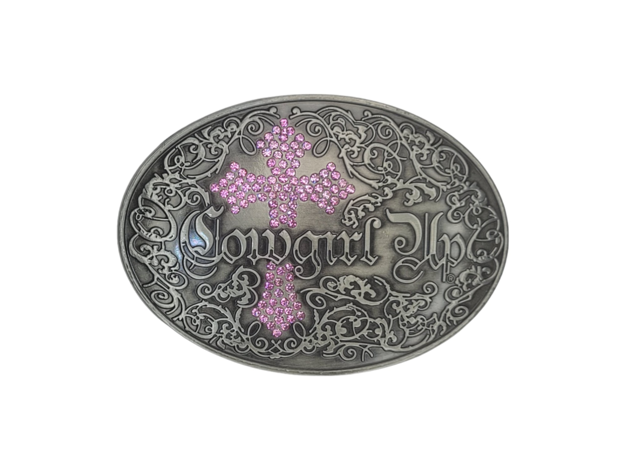 Looking for the perfect finishing touch for your belt? This vintage-inspired silver oval belt buckle, accented with pink rhinestones, is the ideal accessory for any cowgirl.