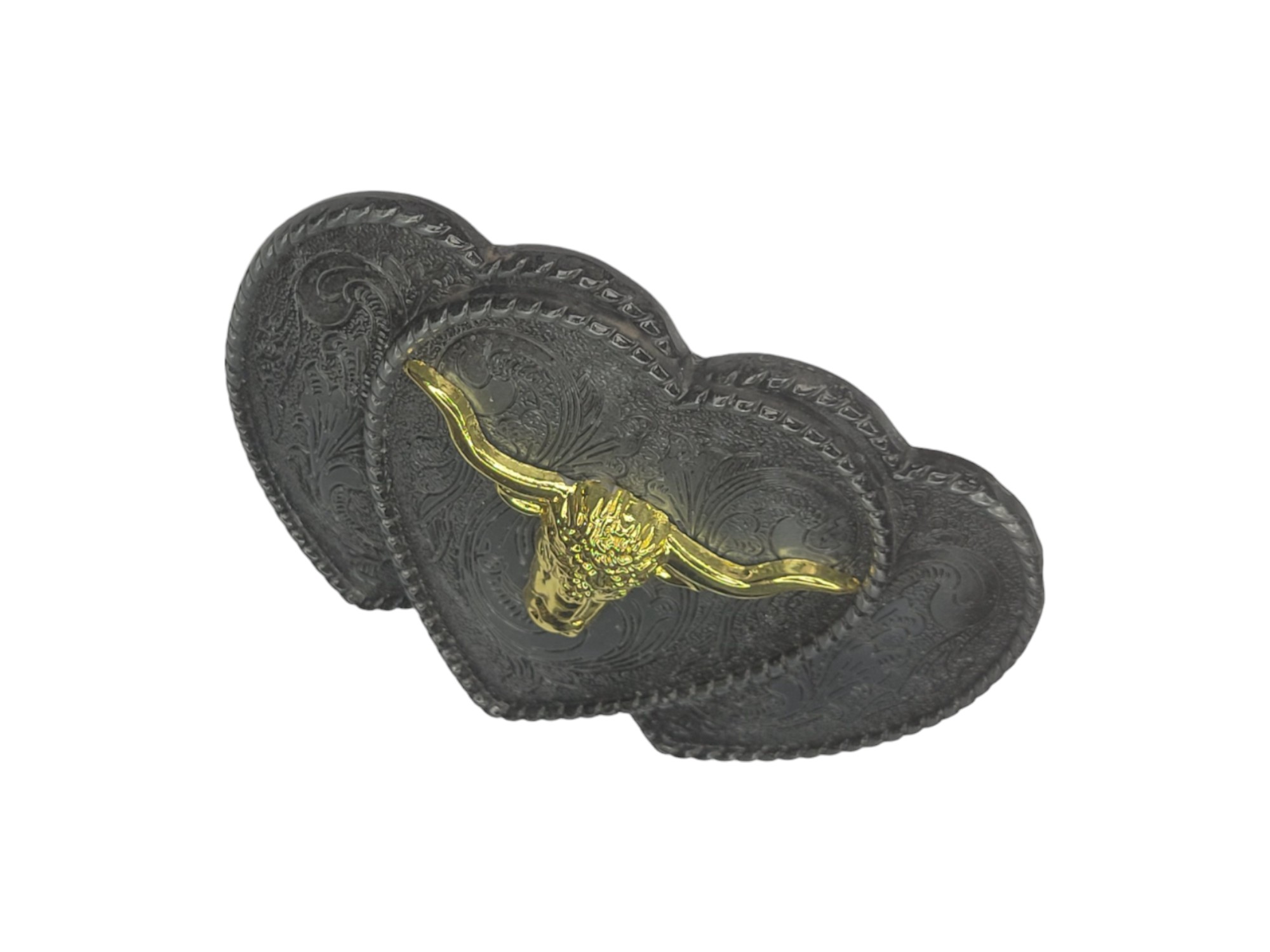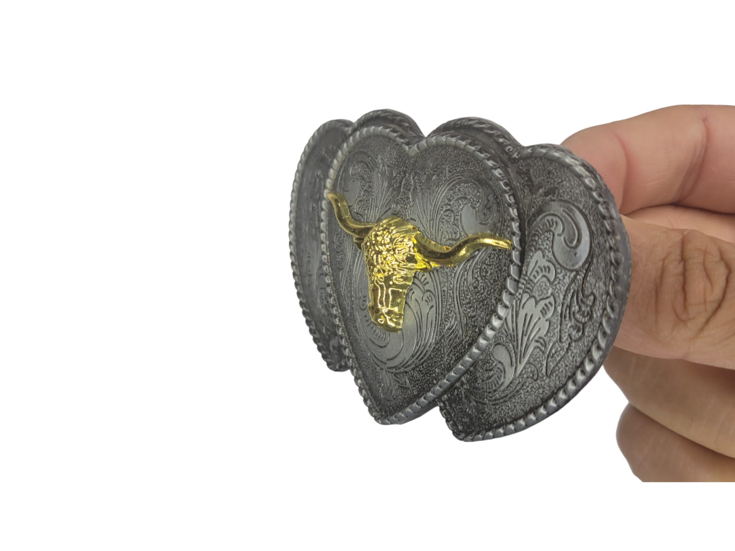 Add a special touch to your belt with this Vintage Silver Triple Heart Belt Buckle, featuring a stunning golden longhorn design. Ideal for cowgirls and anyone looking for a unique, Western-inspired accessory.
