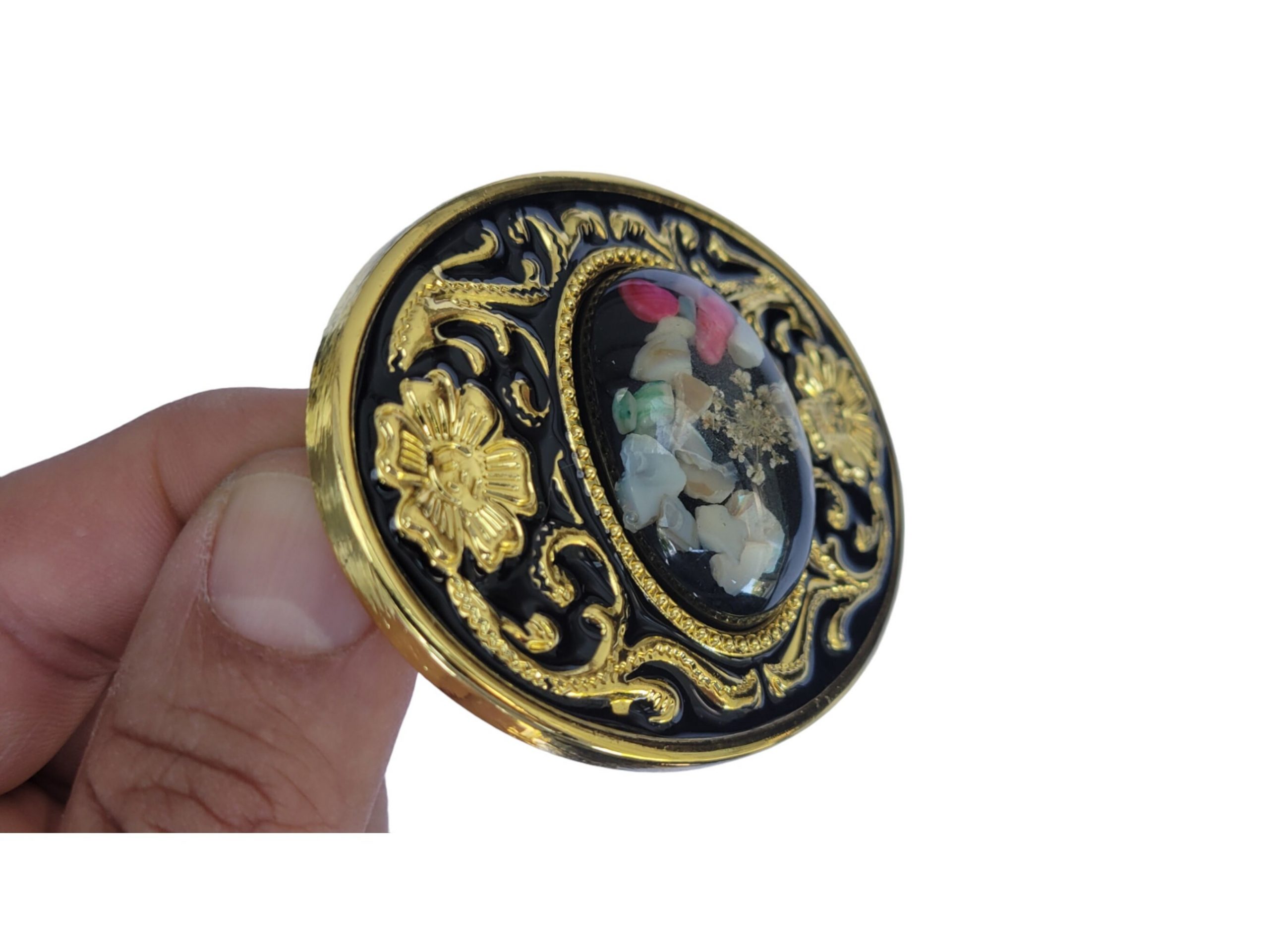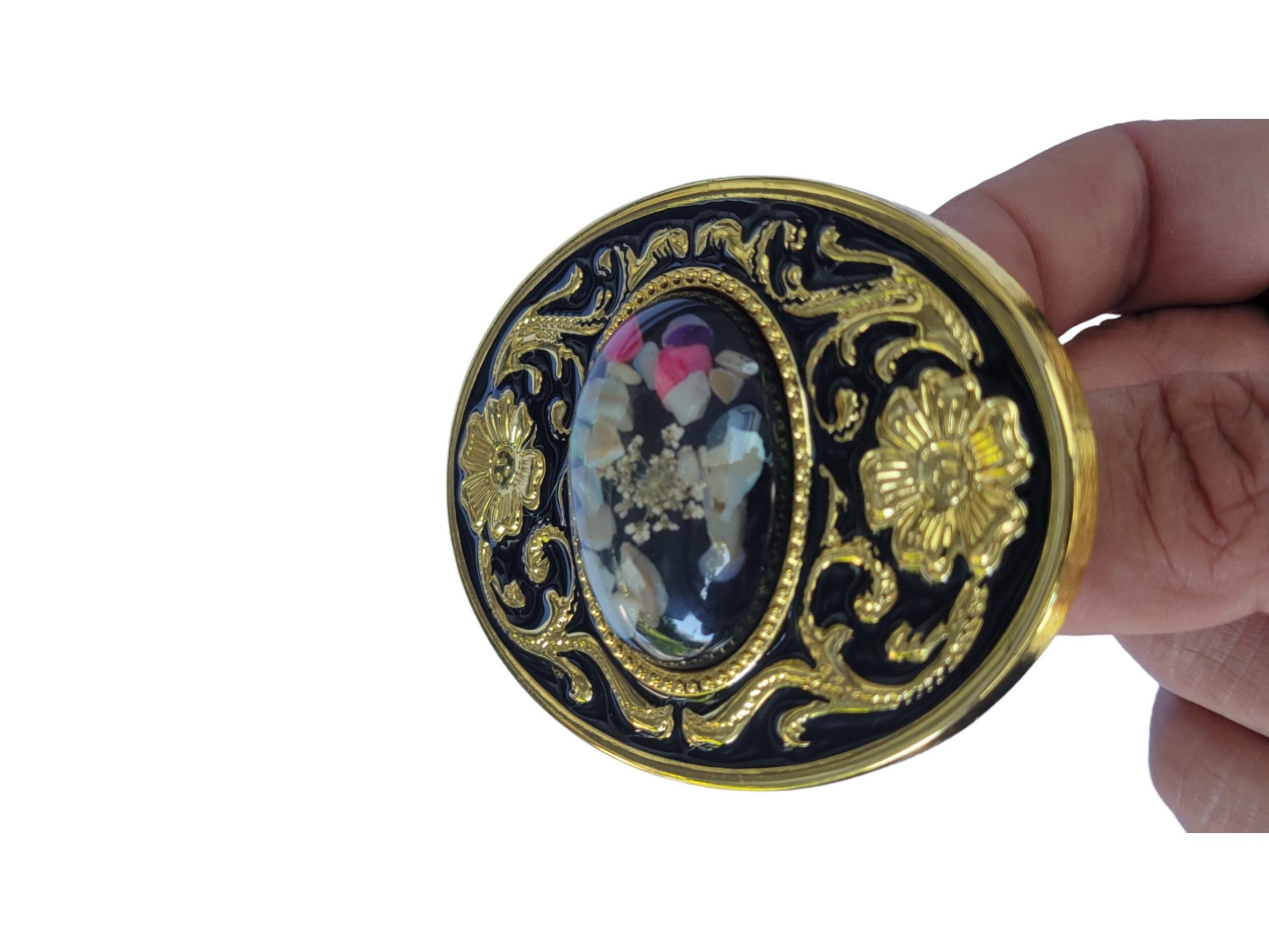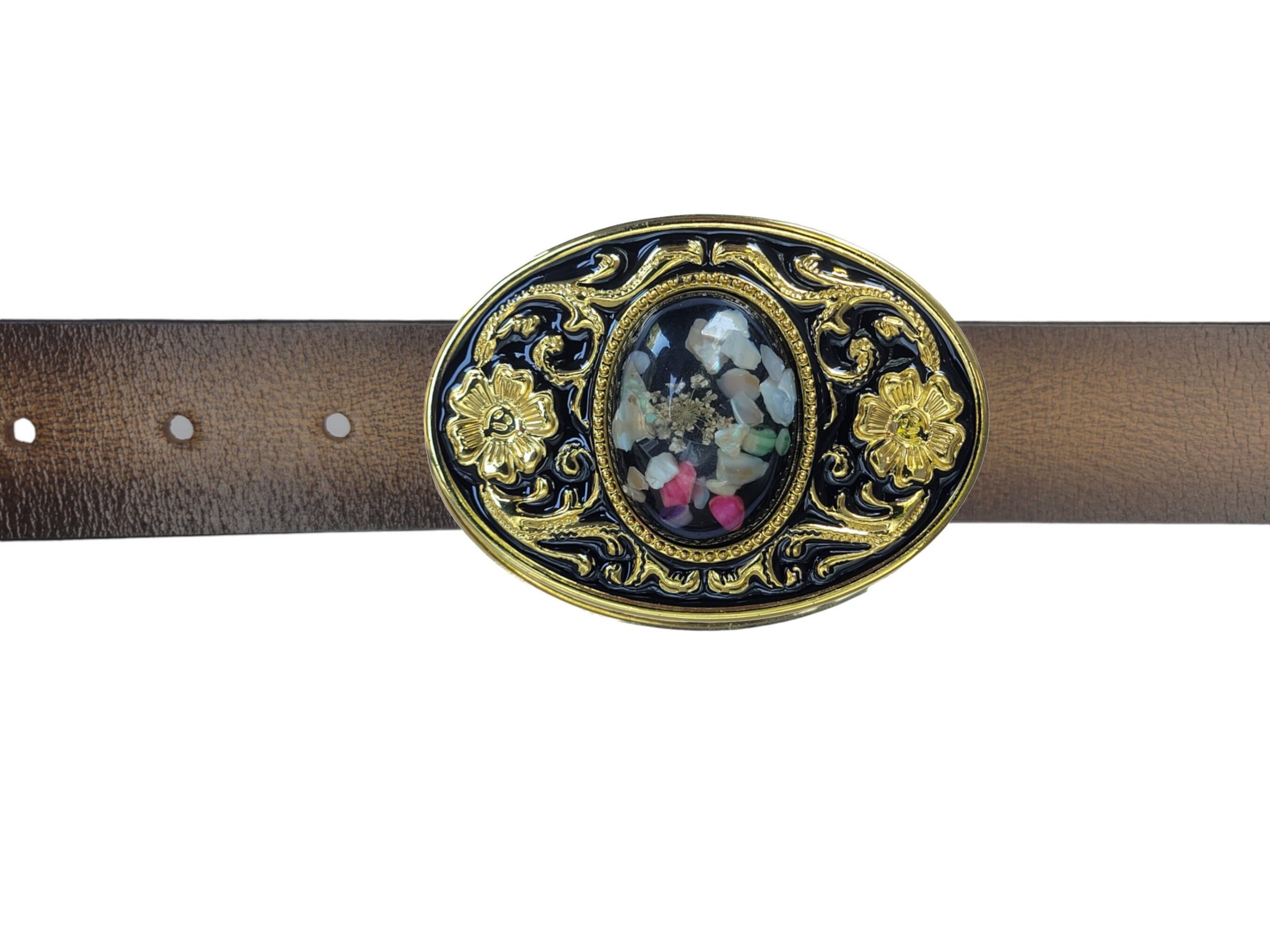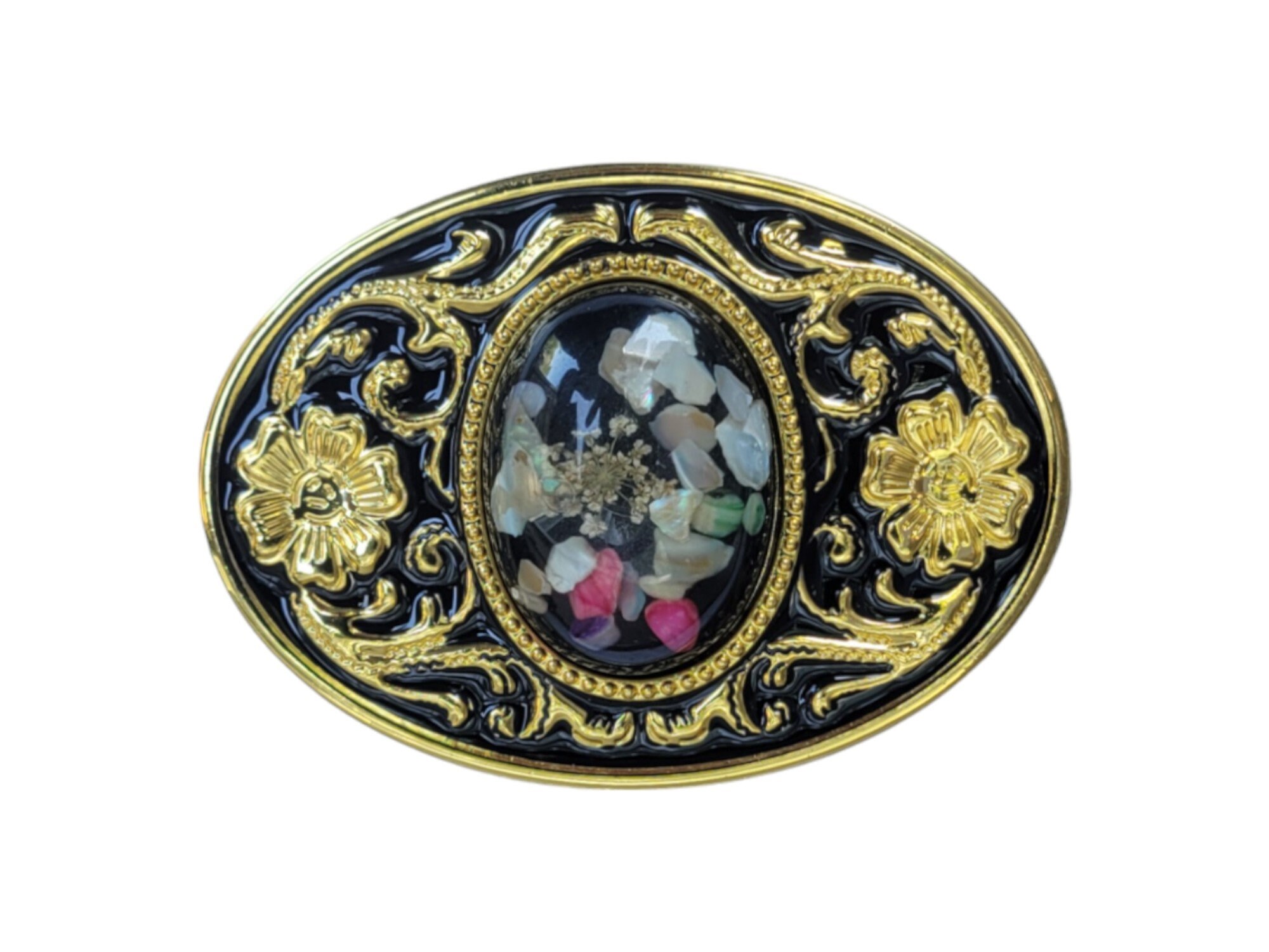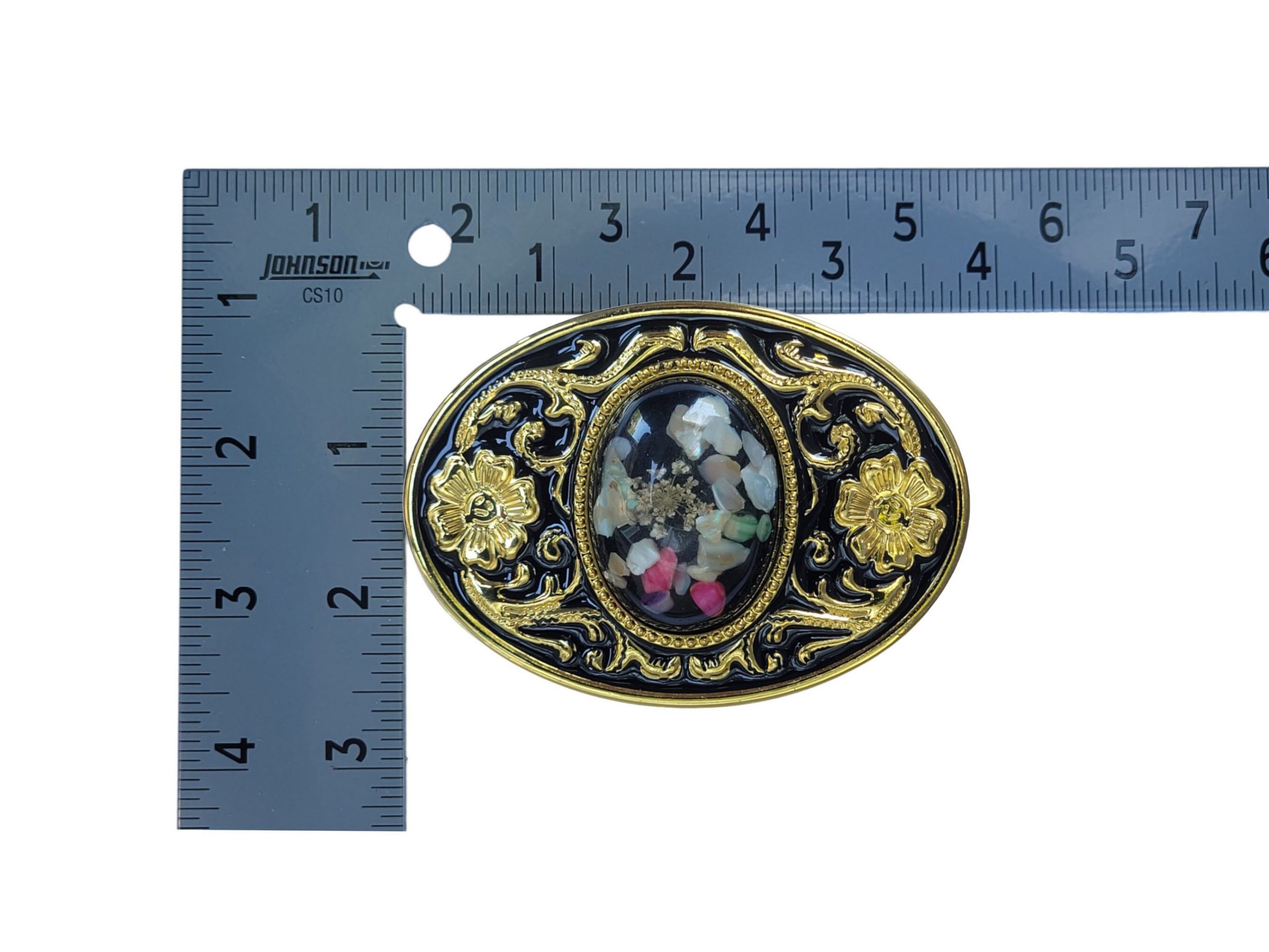 This Western belt buckle showcases a raw gemstone centerpiece, protected by a durable resin coating, and surrounded by a gold and black enamel floral design. A perfect addition to any 1.5-inch Snap-On belt or belts with Chicago screws, it brings a bold and stylish touch to your outfit.