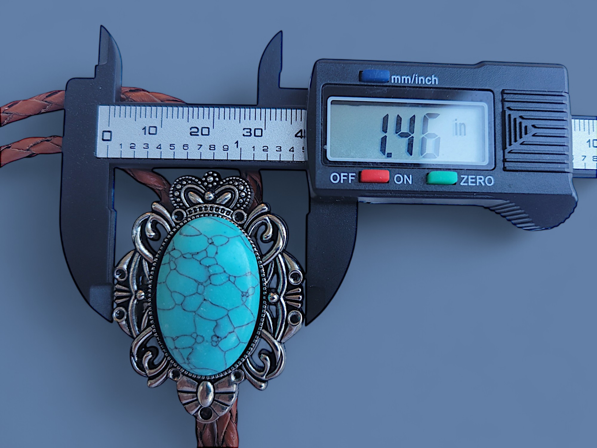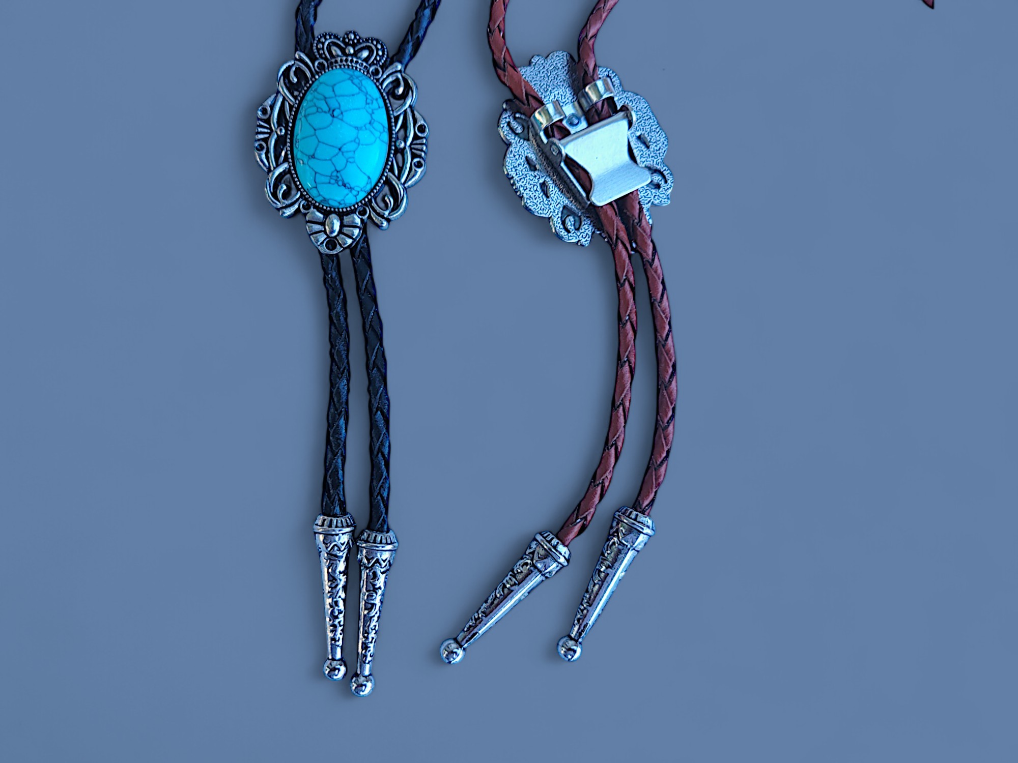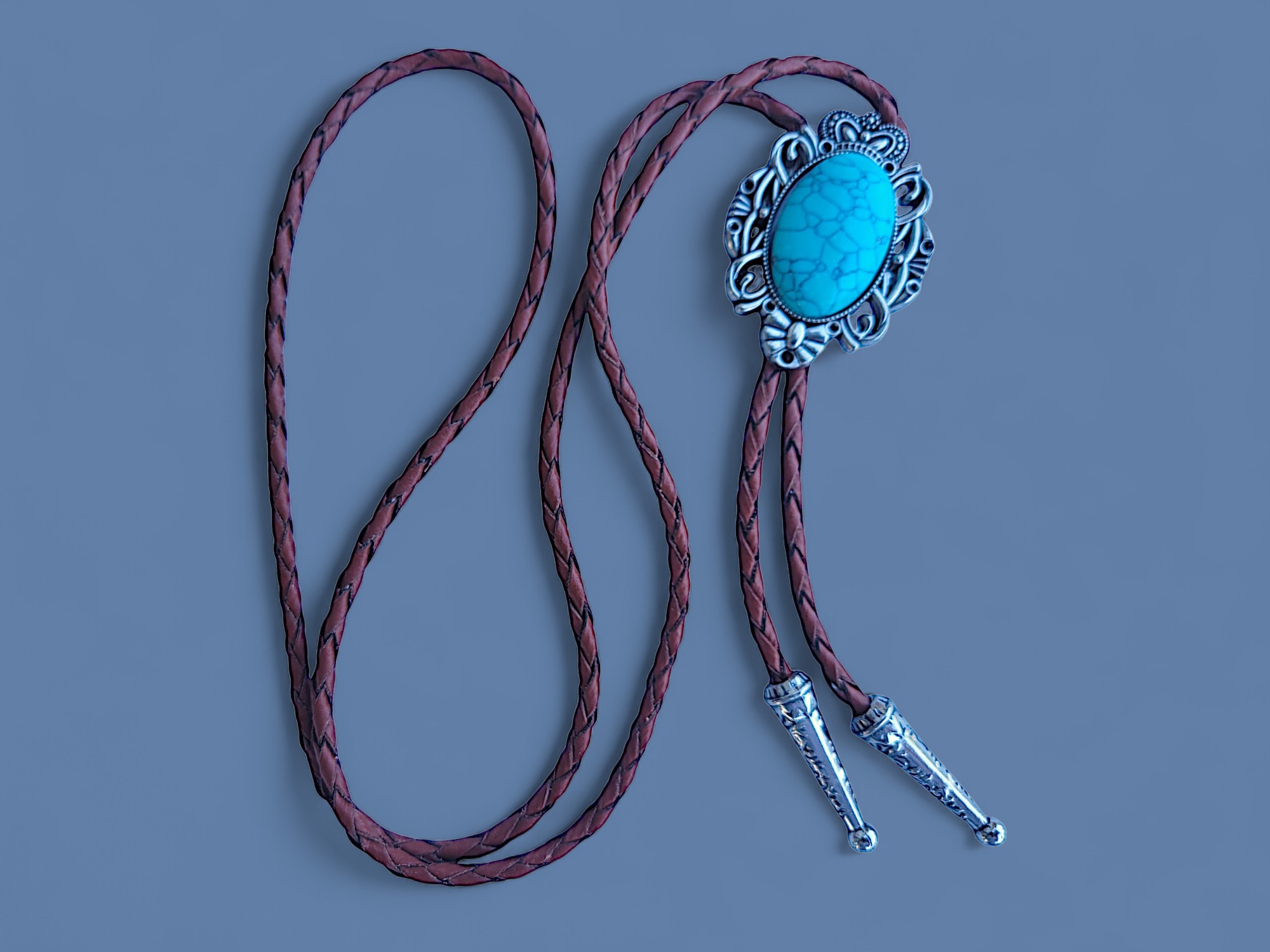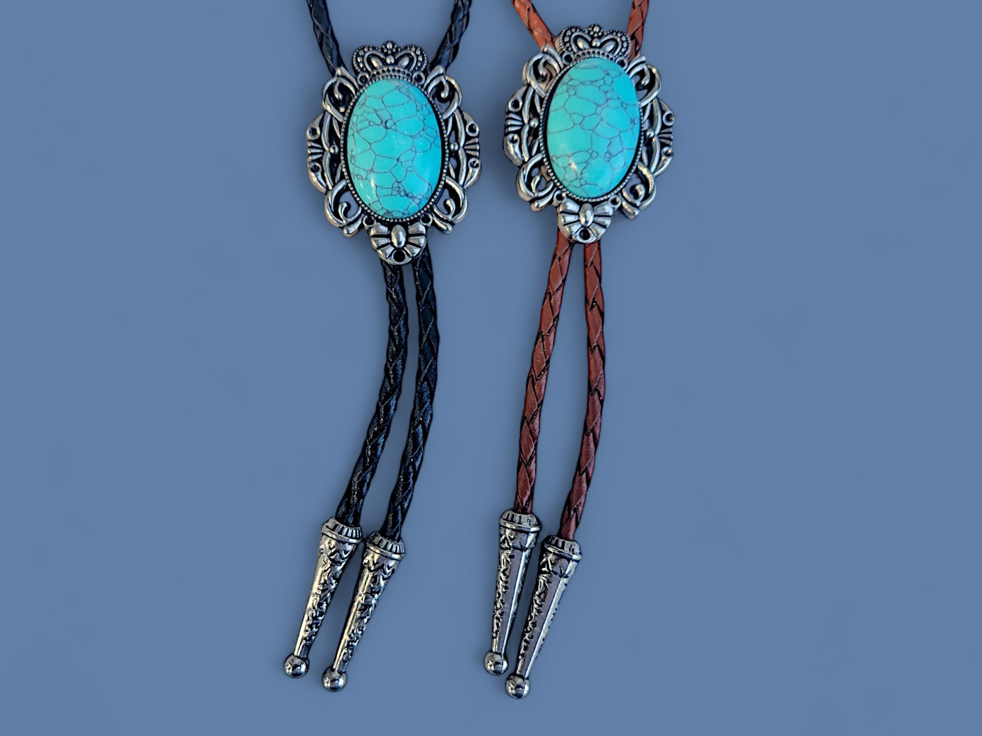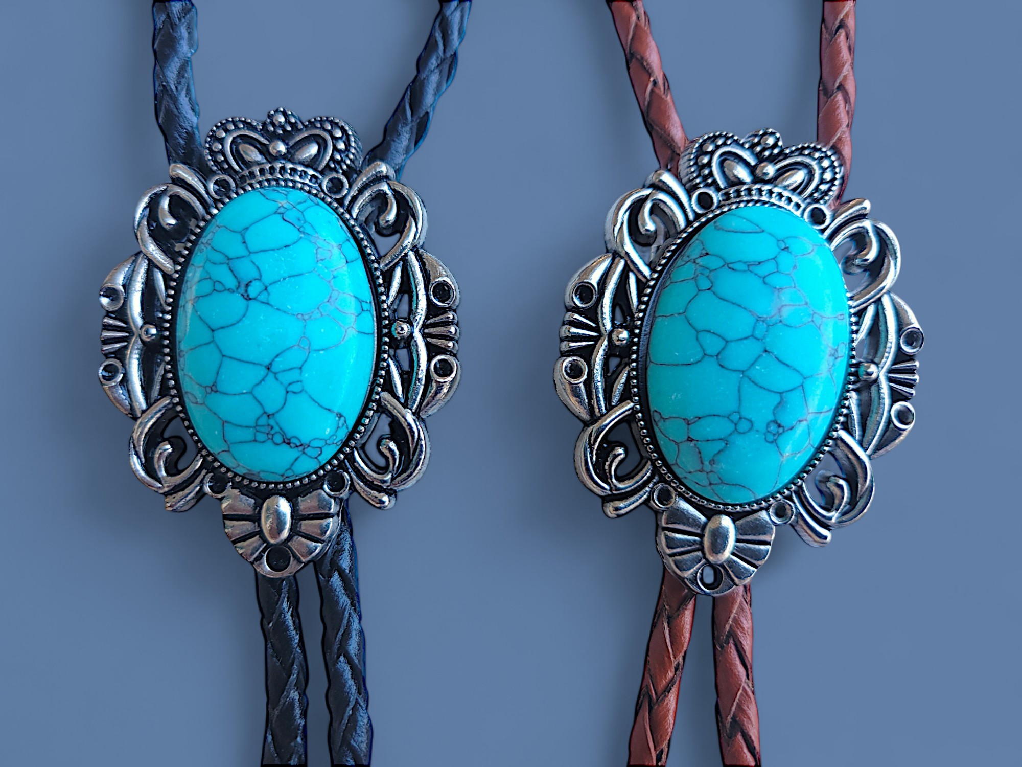 This Western bolo tie features a bold turquoise gemstone set in a vintage-style oval frame — the perfect blend of rustic tradition and modern flair. Whether you’re attending a country wedding, dressing for a Western-themed event, or just love cowboy fashion, this accessory adds a standout finishing touch.