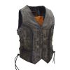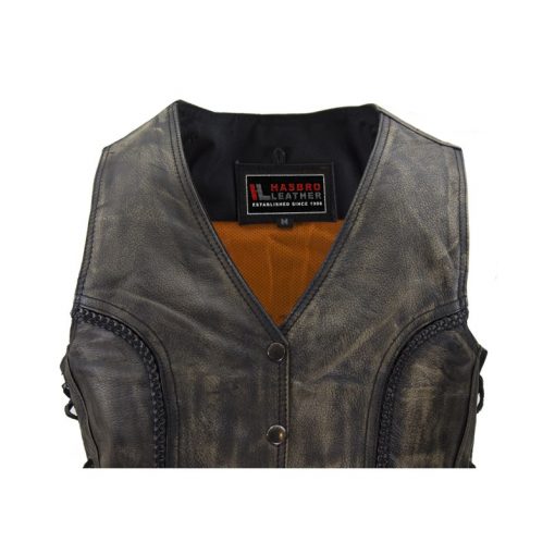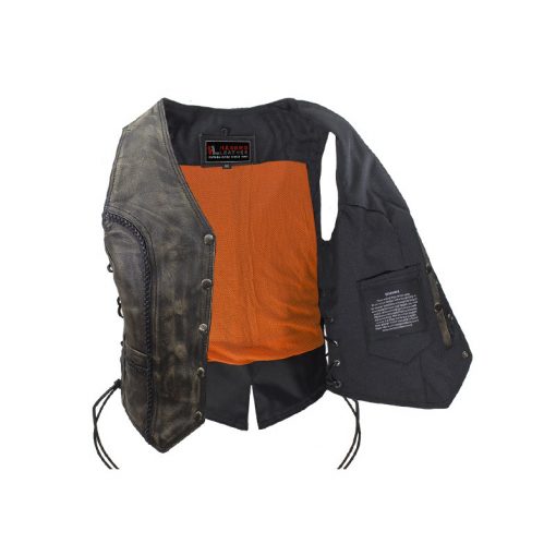 Hasbro apparelsĀ ladies snap-up vest is the #1 choice for ladies who value practicality and smart, stylish looks. Our classic style vest, dyed in a distressed brown color and cut from genuine Soft Touch leather, features beautiful braiding on the front and back, two large concealed gun pockets with elastic straps, one interior stash pocket on the left, and two exterior stash pockets on the waist. Your comfort’s guaranteed with the soft orange mesh lining, four button snaps, greater length than the previous version, and leather side laces for adjustable fit. Be sure to place your order today as these incredible vest move fast.